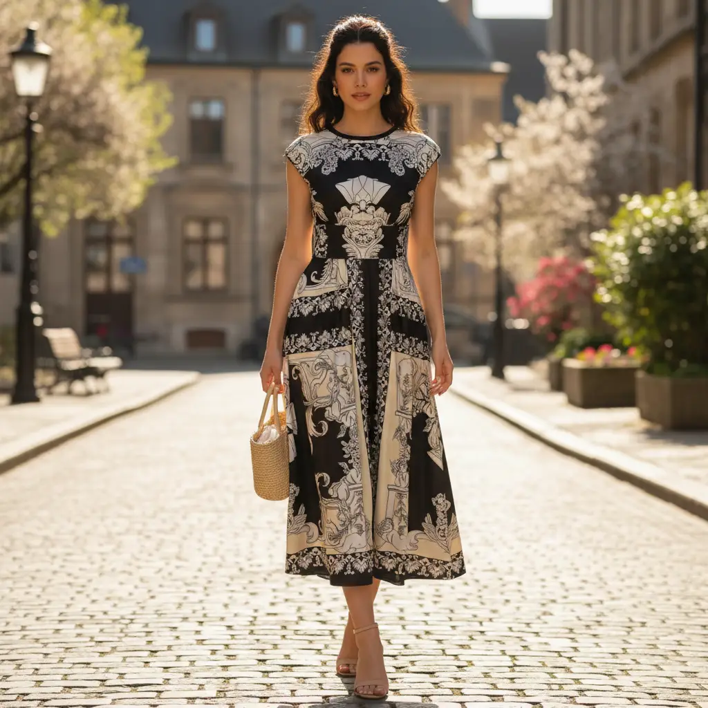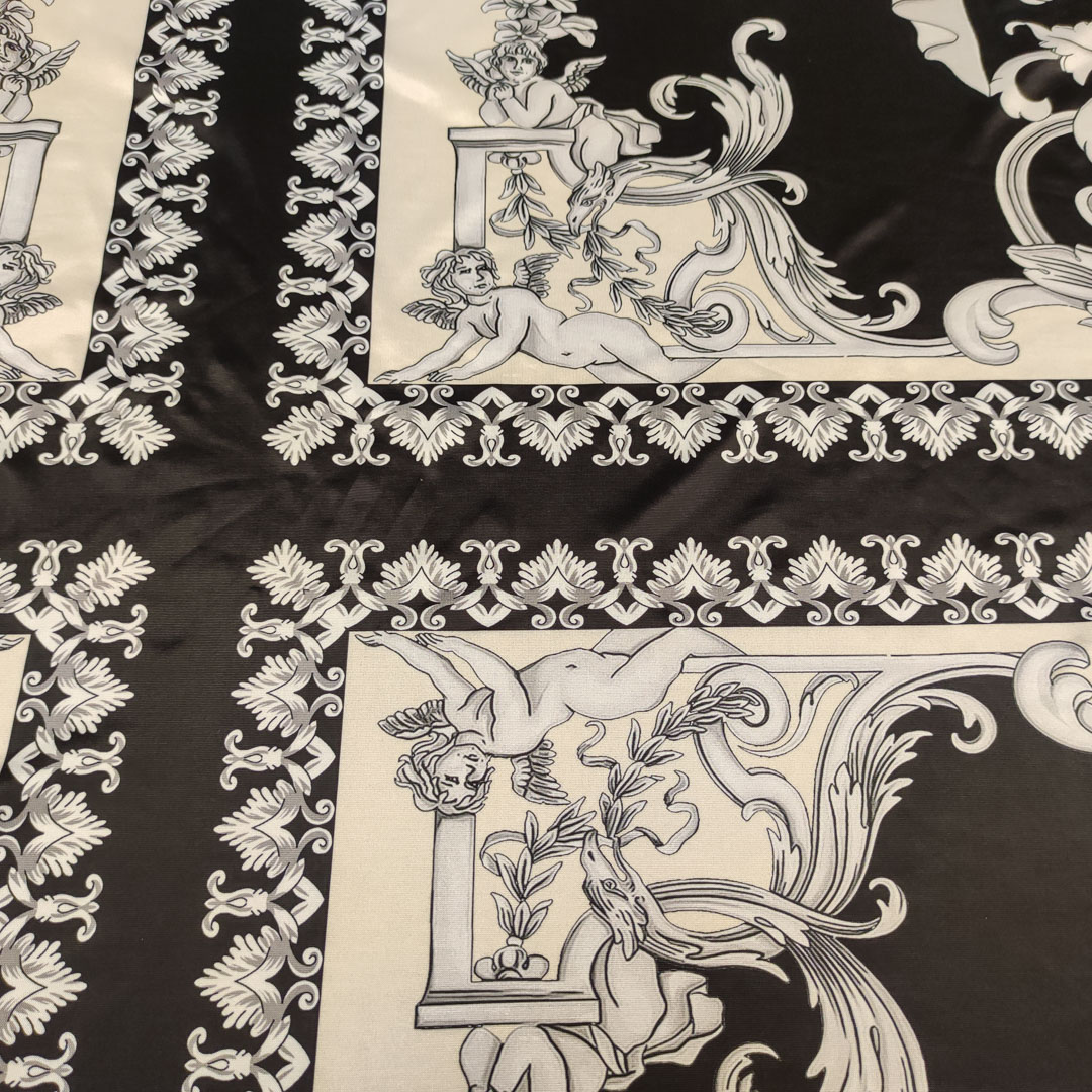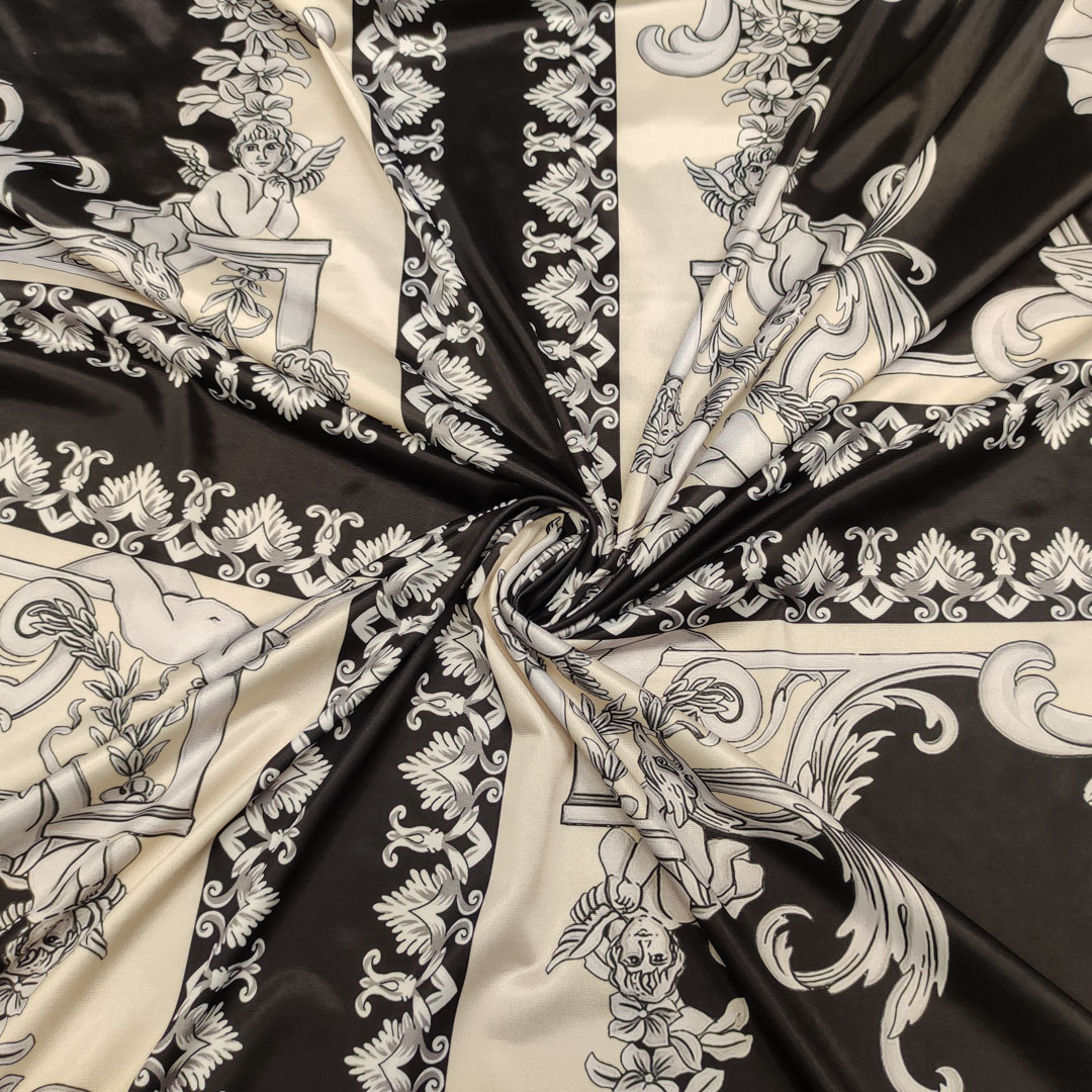 Tessuto Jersey lucido a fantasia motivo floreale barocco beige – nero