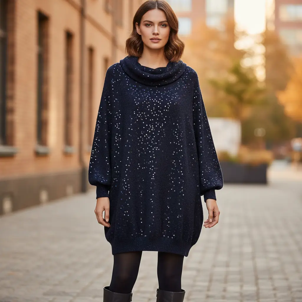 Tessuto Maglia Mano Lana ricamato con paillettes tinta blu