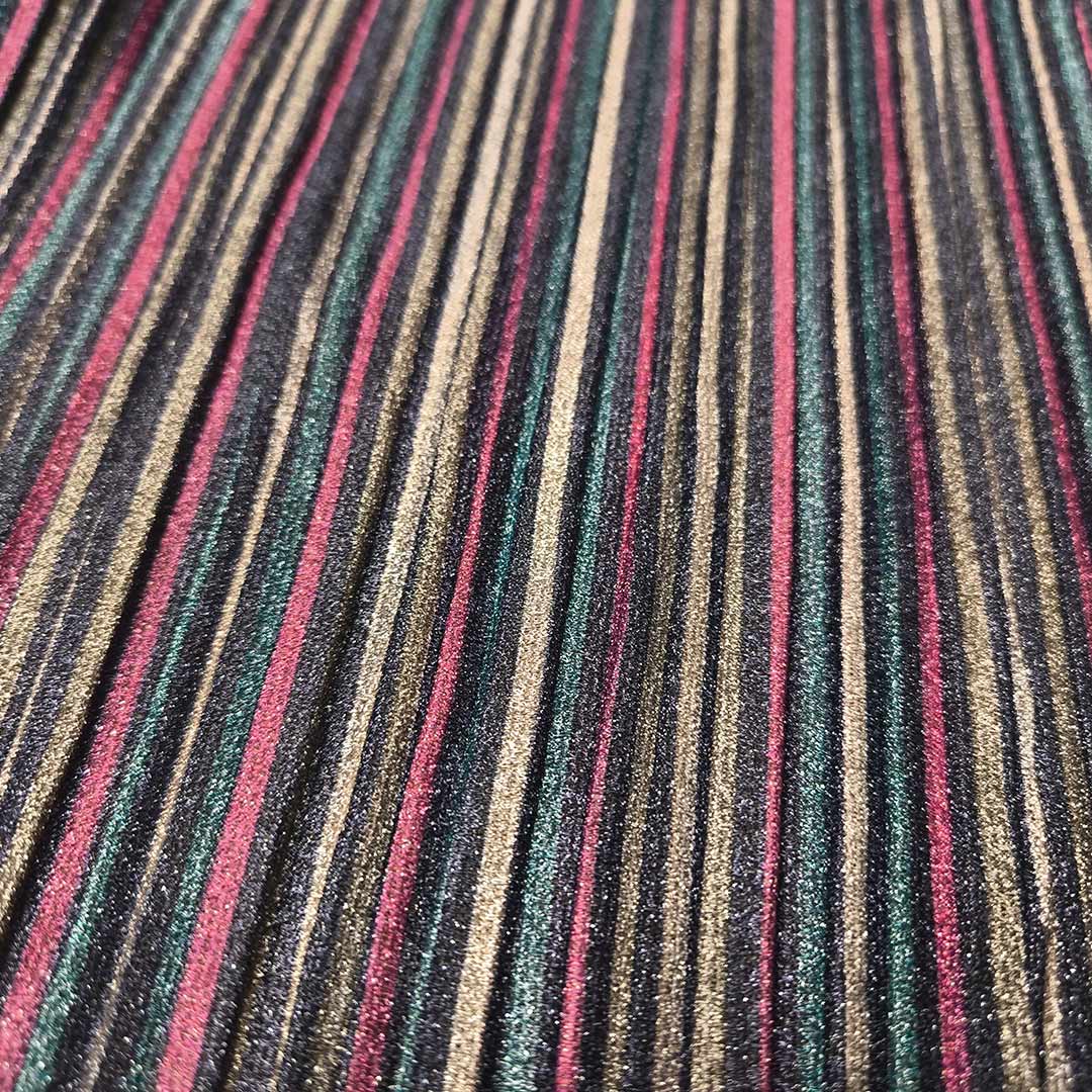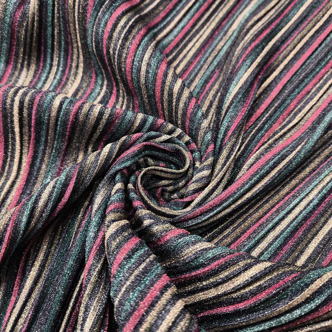 Tessuto Jersey lurex plissè dalla mano morbida, fluida e cadente, si presta alla creazione di capi scintillanti e lucenti da cerimonia e per le grandi occasioni come: abiti, gonne , stole e spolverini.