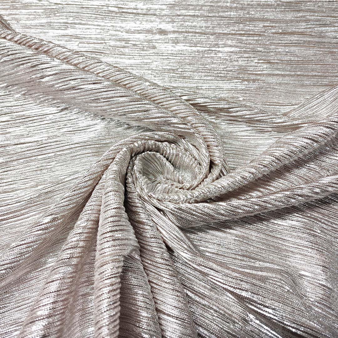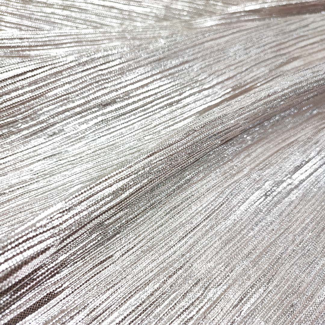 Tessuto Jersey plissè spalmato,dalla mano morbida e leggera, ideale per realizzare capi lucenti e scintillanti come: stole, abiti, spolverini e gonne.