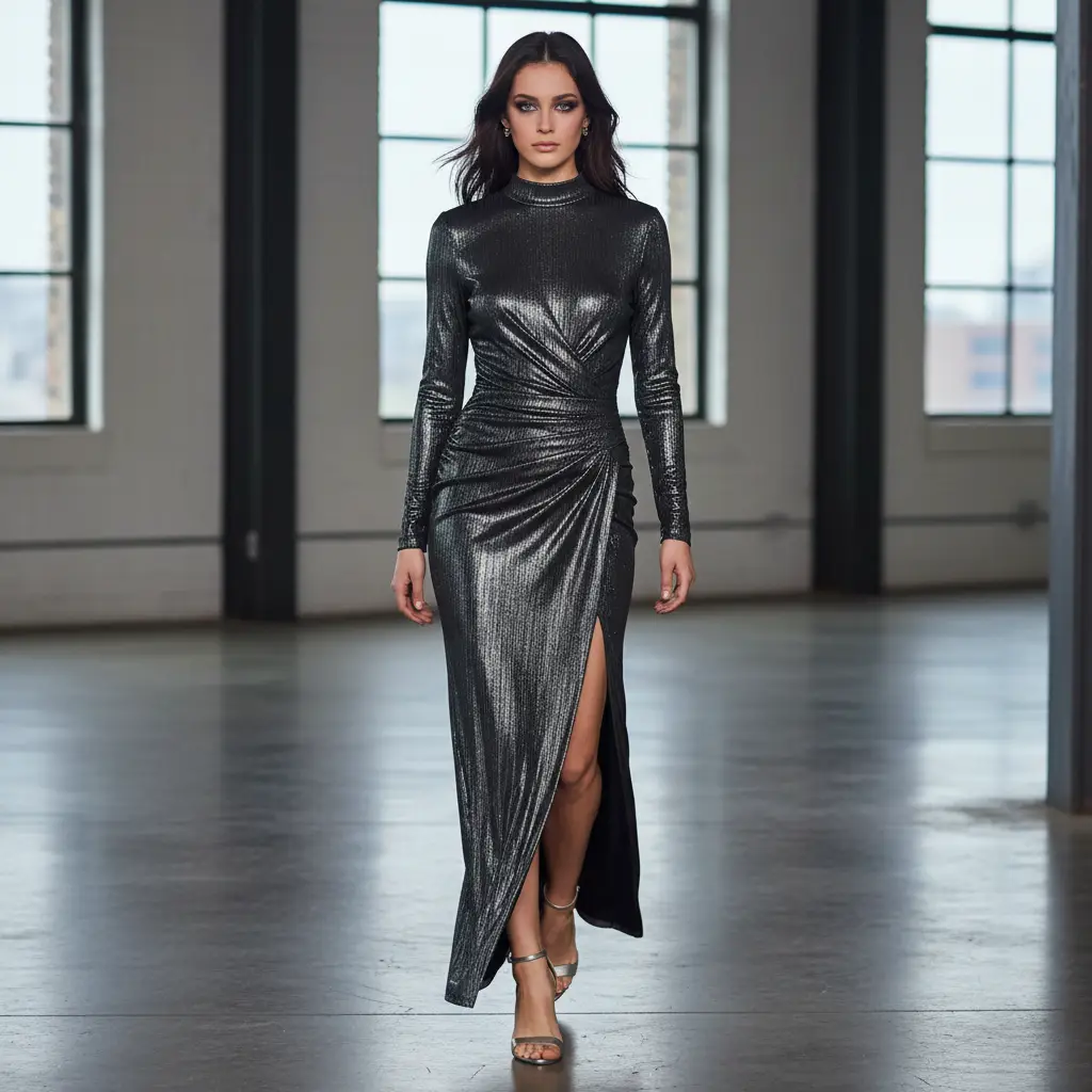 Tessuto Jersey spalmato,dalla mano morbida e leggera, ideale per realizzare capi lucenti e scintillanti come: stole, abiti, spolverini e gonne.