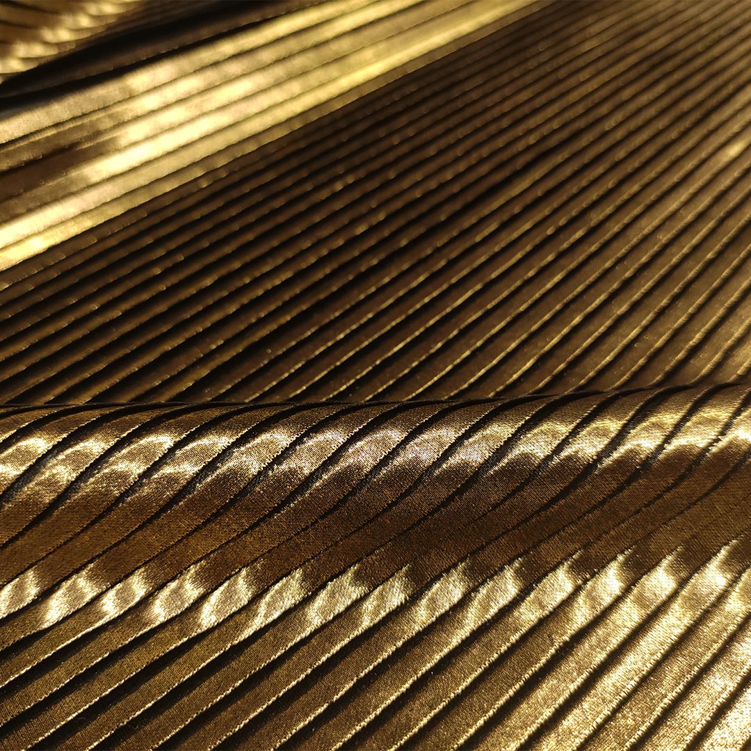 Tessuto Jersey spalmato effetto plissè,dalla mano morbida e leggera, ideale per realizzare capi lucenti e scintillanti come: stole, abiti, spolverini e gonne.