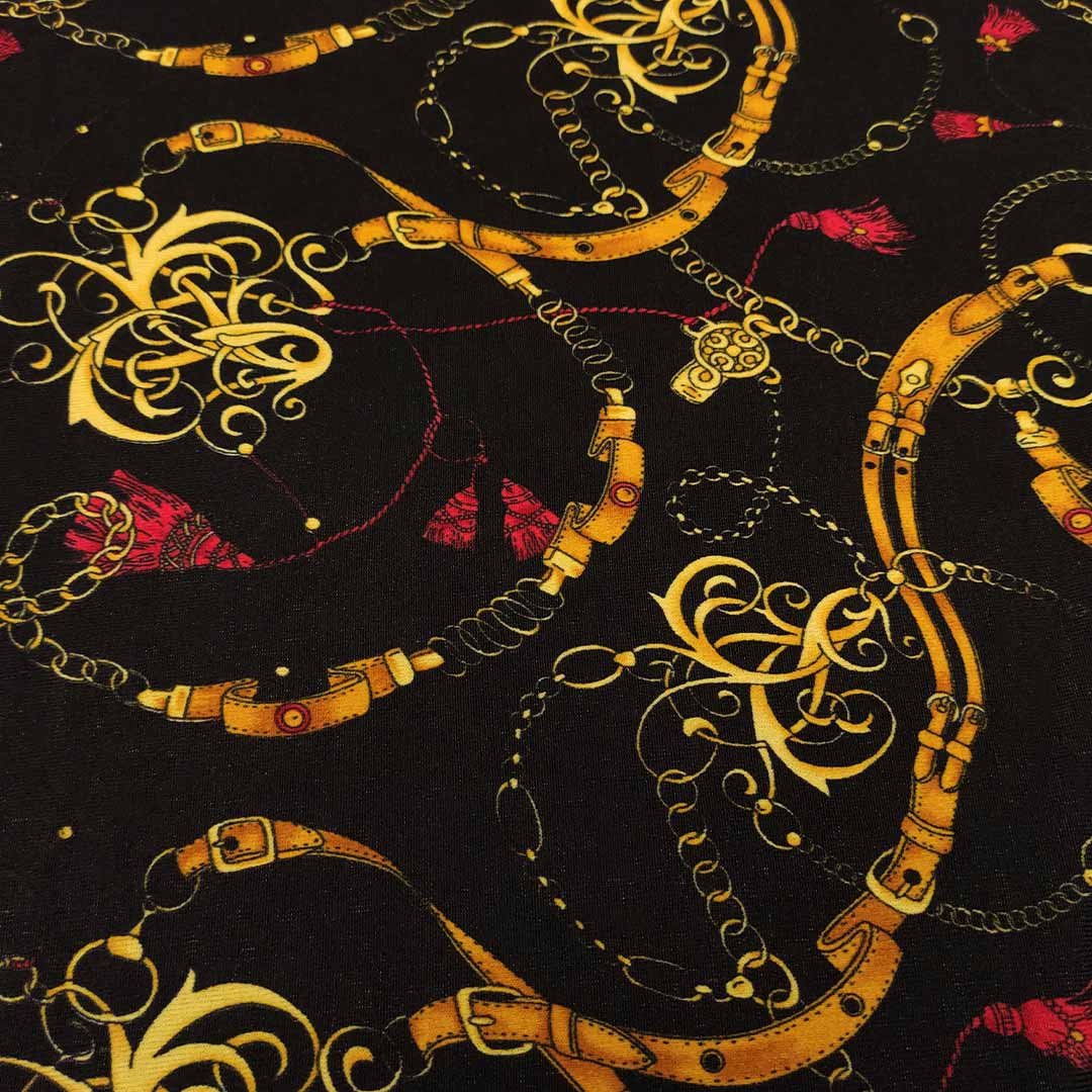 Tessuto Jersey peso autunnale a fantasia motivo astratto oro – rosso – nero