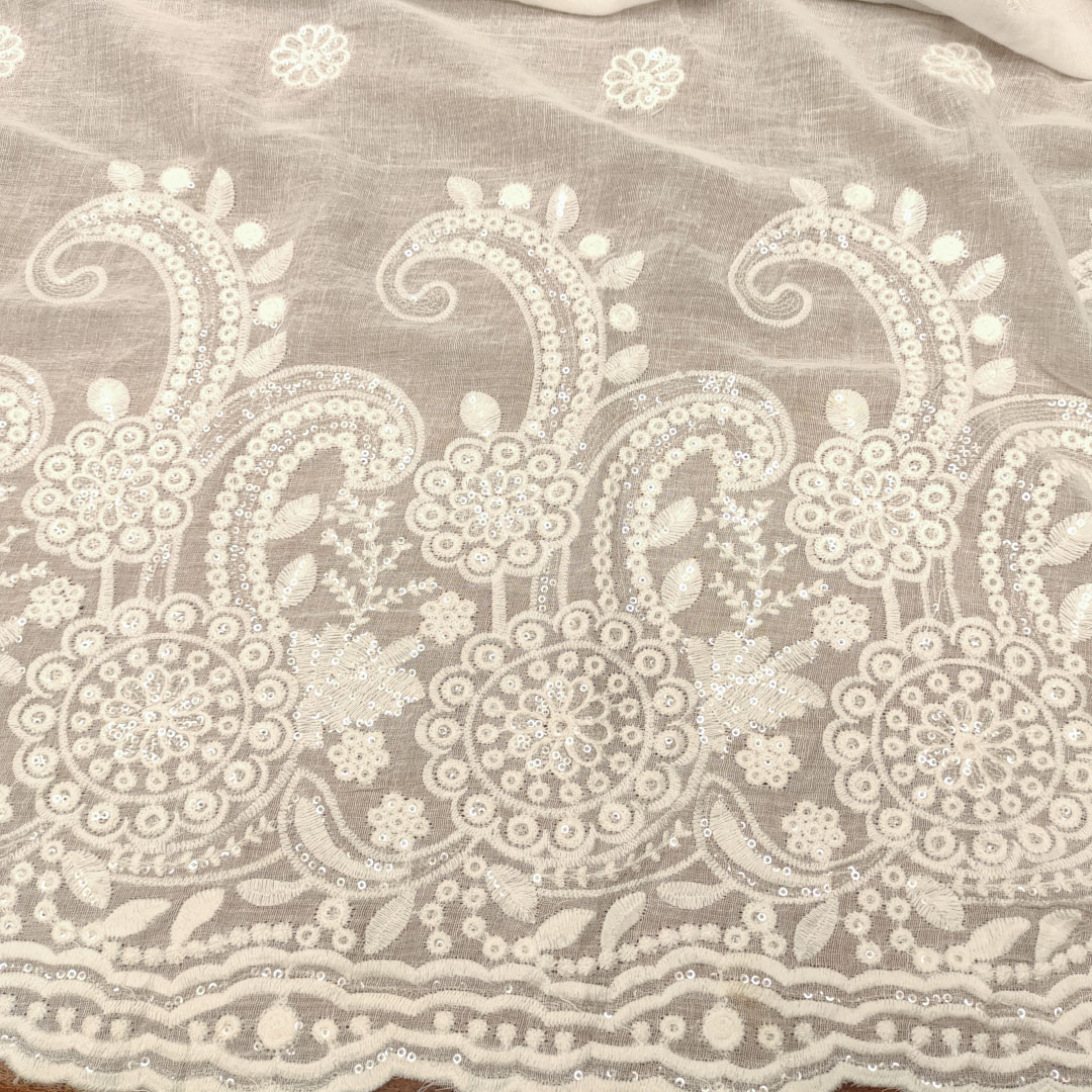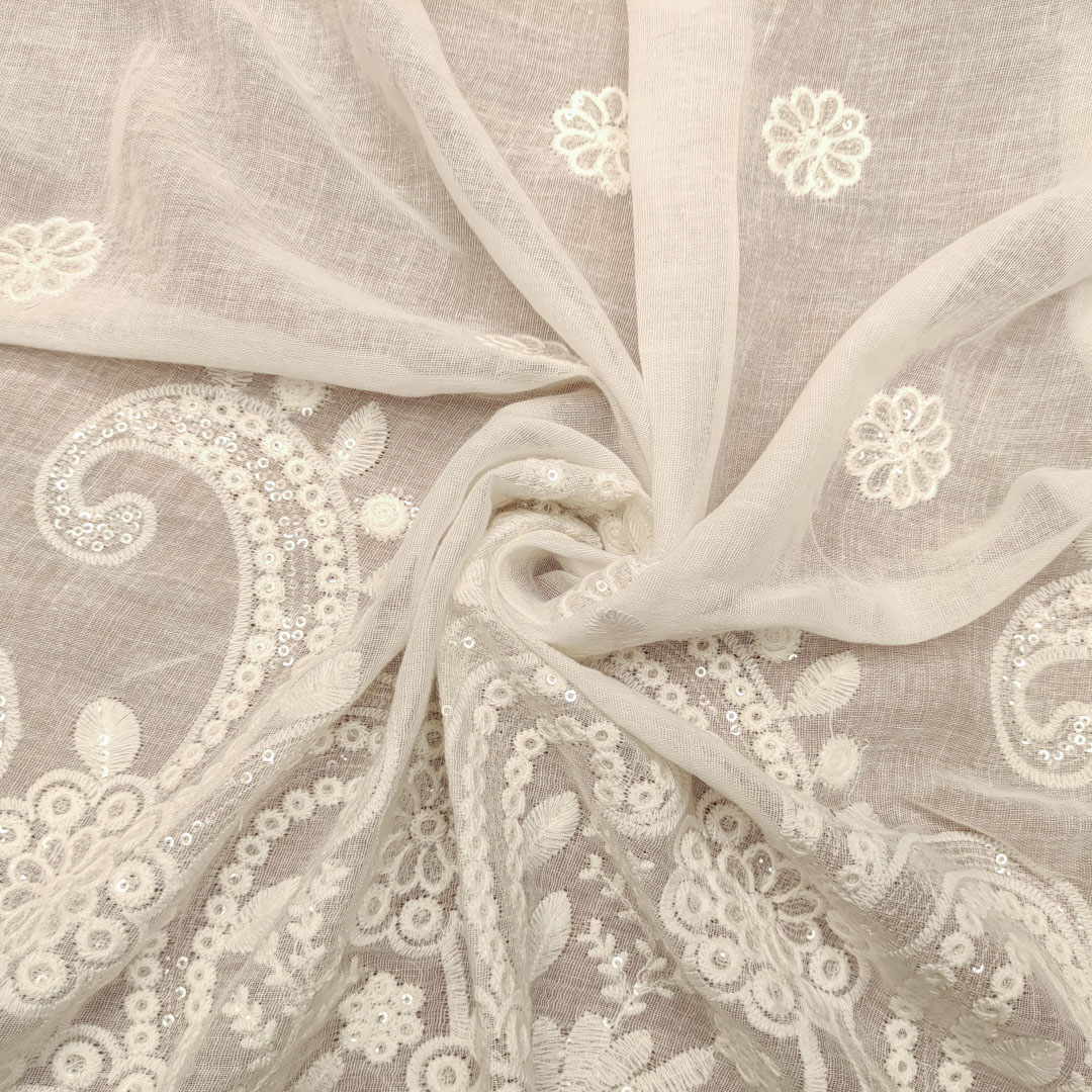 Tessuto Garza di lino ricamato con paillettes motivo floreale bianco seta