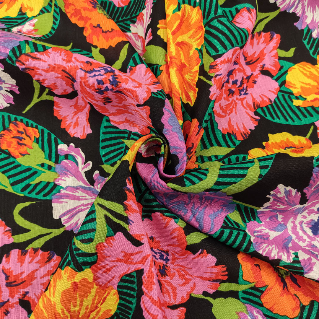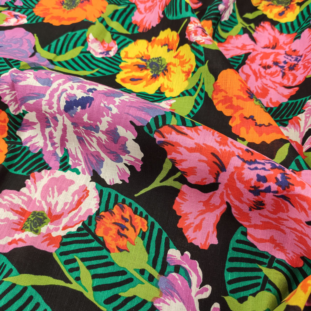 Tessuto Misto lino a fantasia motivo floreale fucsia – nero – verde