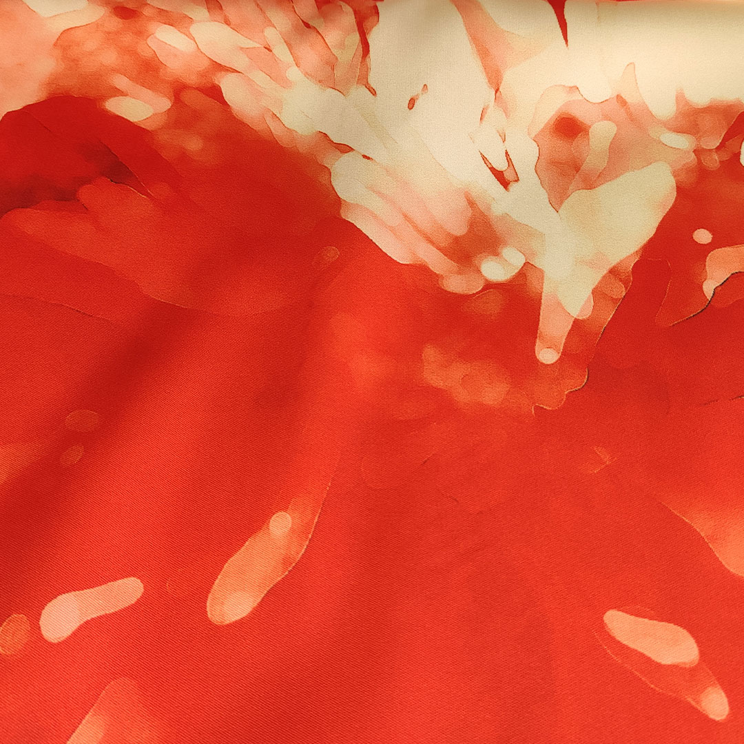 Tessuto Mikado a fantasia motivo astratto corallo – arancione