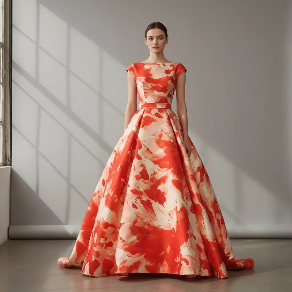 Il Tessuto Mikado a fantasia è considerato uno dei tessuti più eleganti e strutturati in assoluto, si presta alla creazione di abiti da cerimonia come abiti rigidi e strutturati, gonnelloni e giacche, inoltre è indicato per realizzare abiti da sposa.