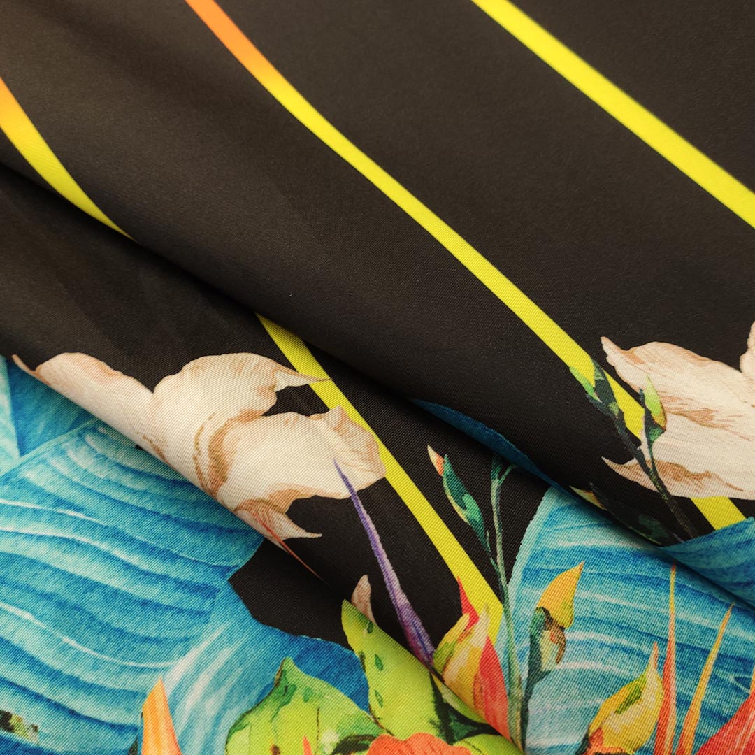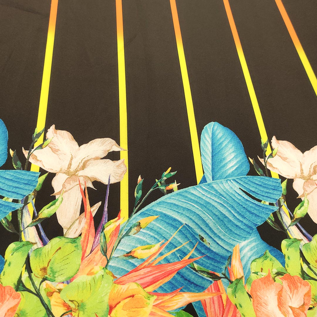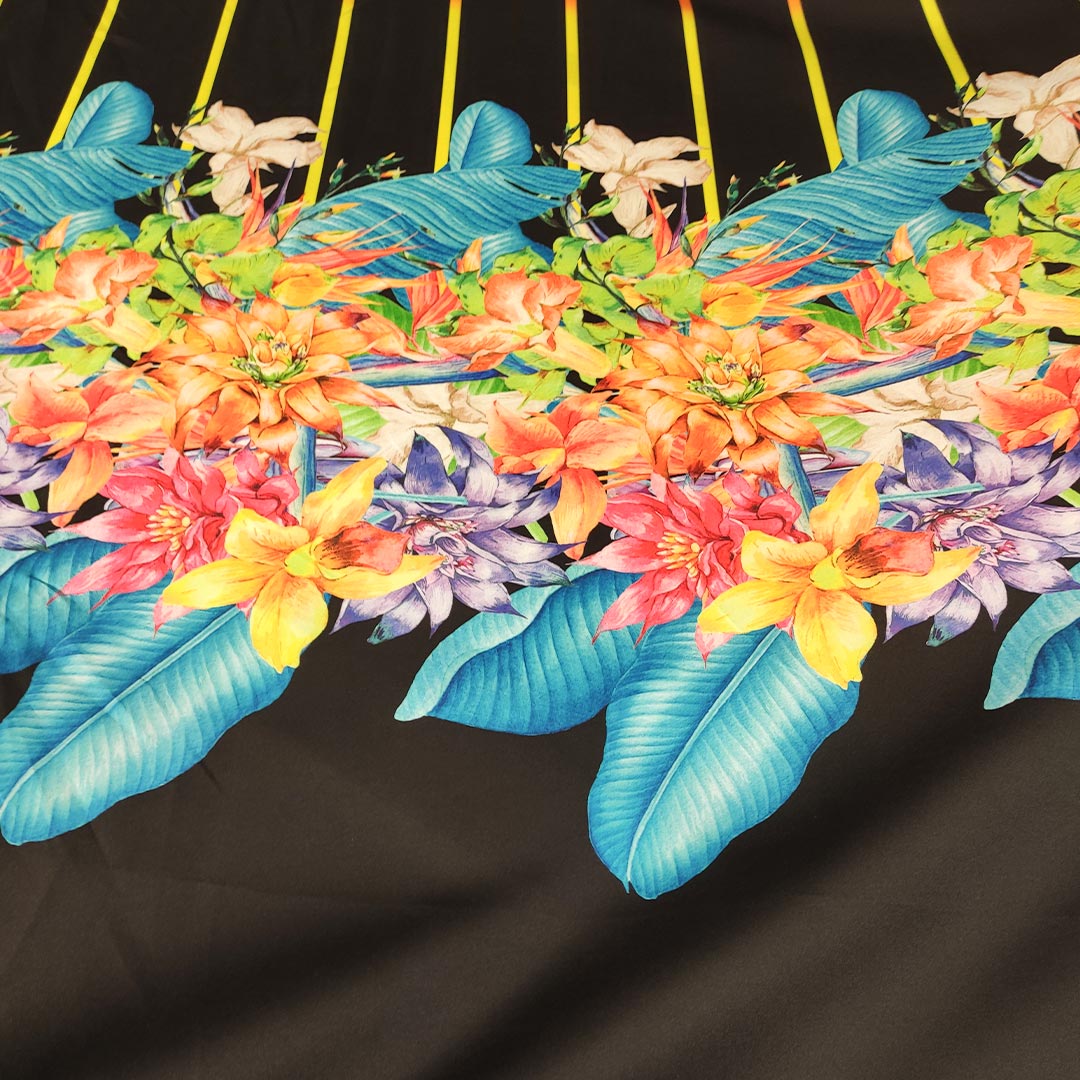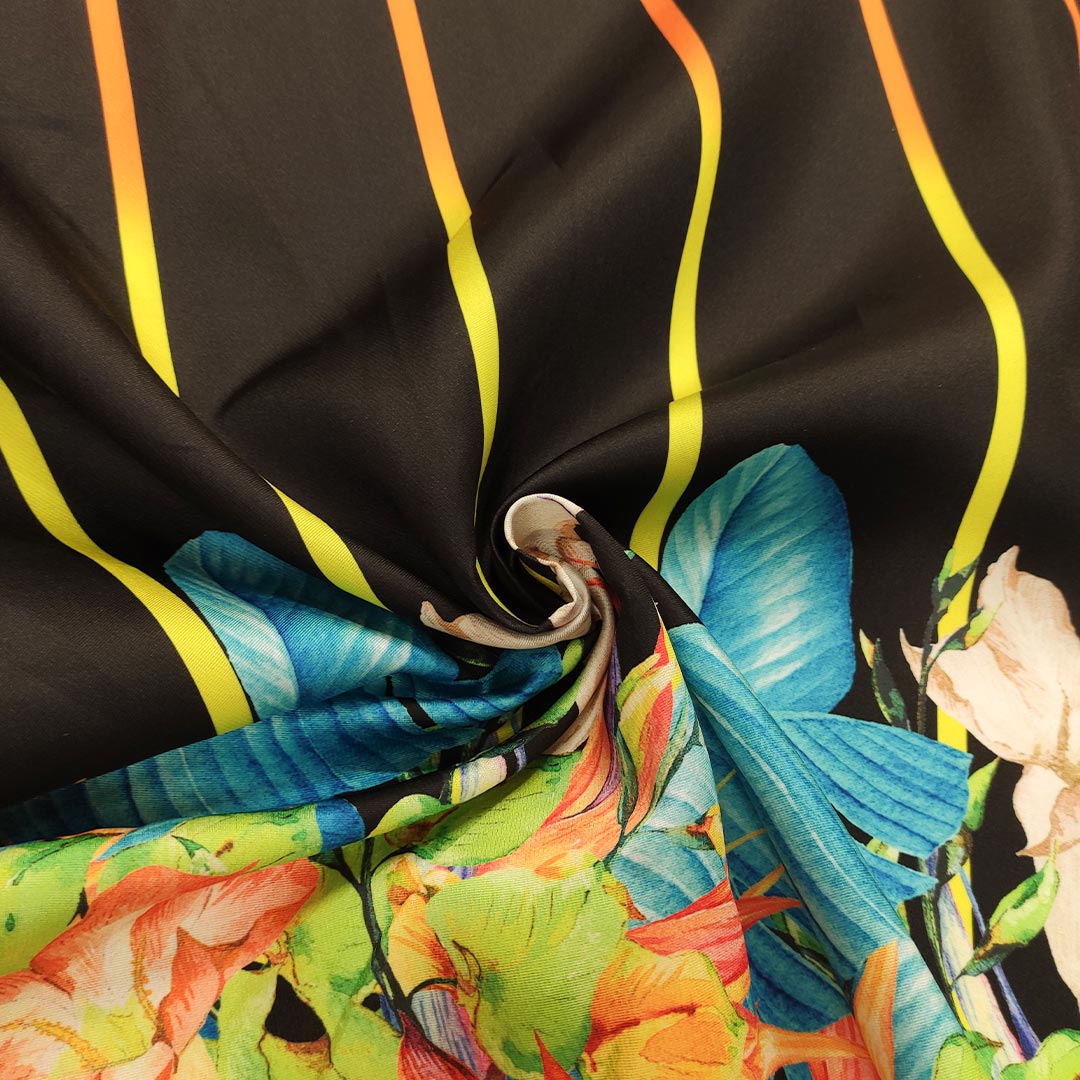Tessuto Mikado a fantasia motivo floreale nero – turchese – arancione – verde – giallo