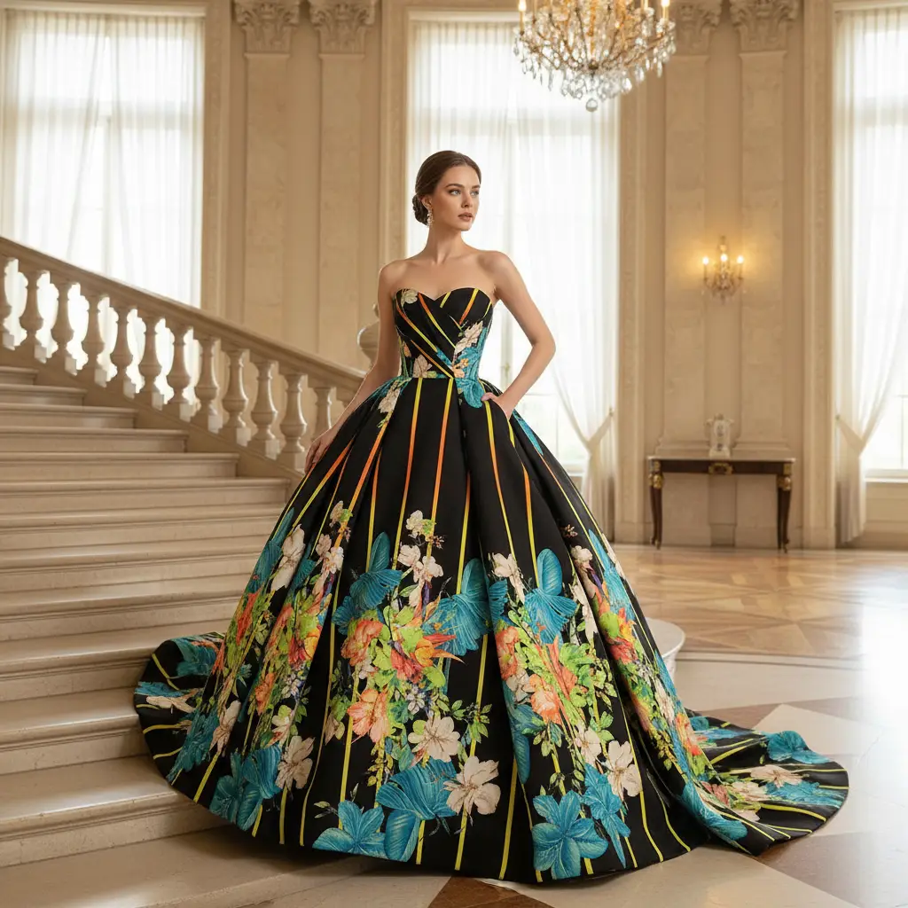 Il Tessuto Mikado a fantasia è considerato uno dei tessuti più eleganti e strutturati in assoluto, si presta alla creazione di abiti da cerimonia come abiti rigidi e strutturati, gonnelloni e giacche, inoltre è indicato per realizzare abiti da sposa.