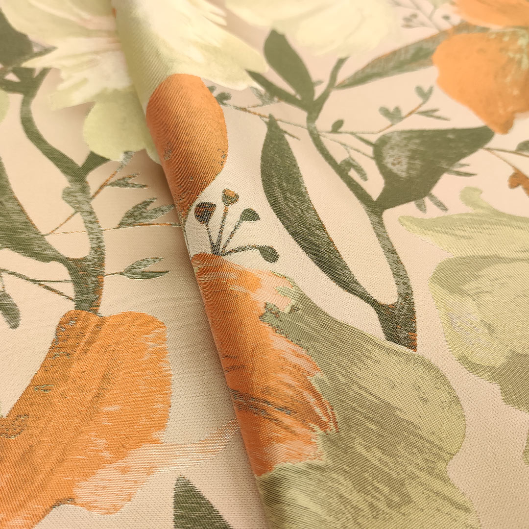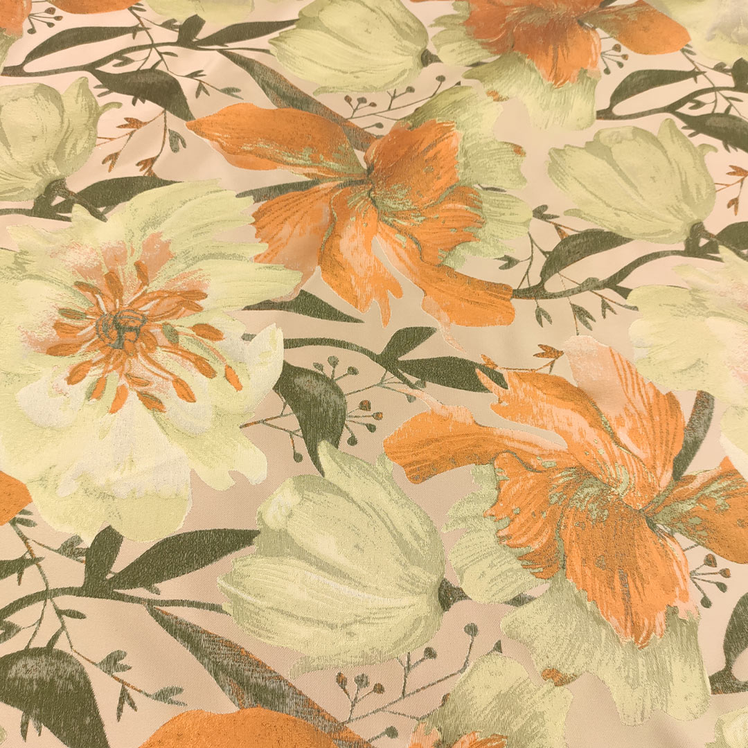 Tessuto Mikado jacquard a fantasia motivo floreale verde mela – arancione – verde