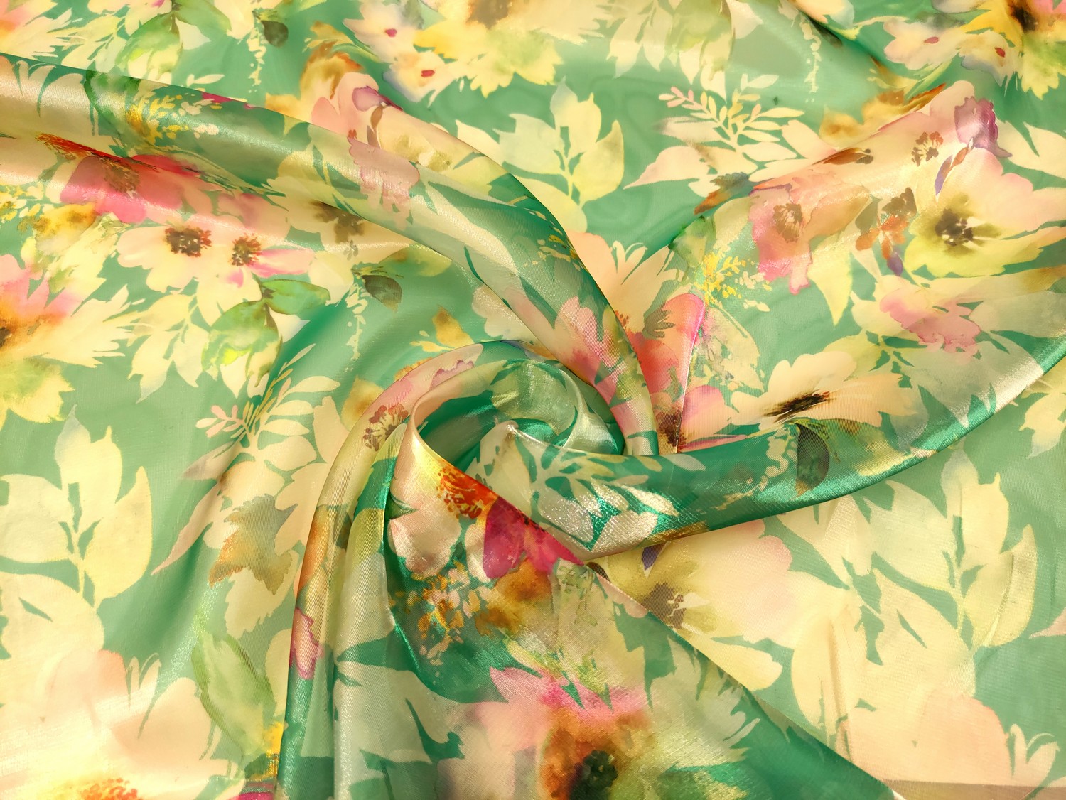 Tessuto Organza a fantasia motivo floreale acquamarina – rosa
