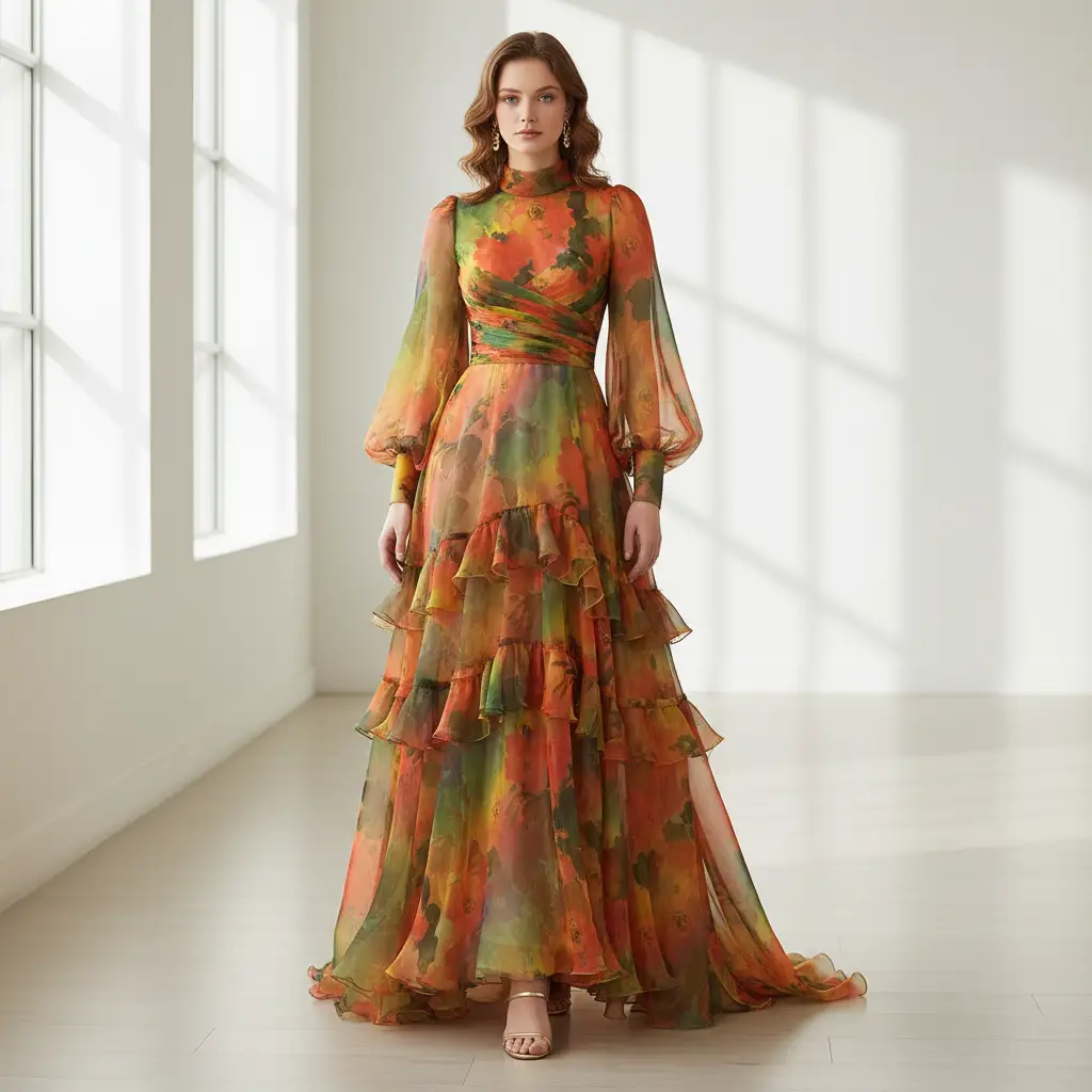 Tessuto Organza a fantasia dalla mano fluente e vaporosa, dall’ aspetto lucido, si presta alla creazione di capi esclusivi e ricercati da cerimonia o Prêt-à-porter come: camicie, abiti e bluse.