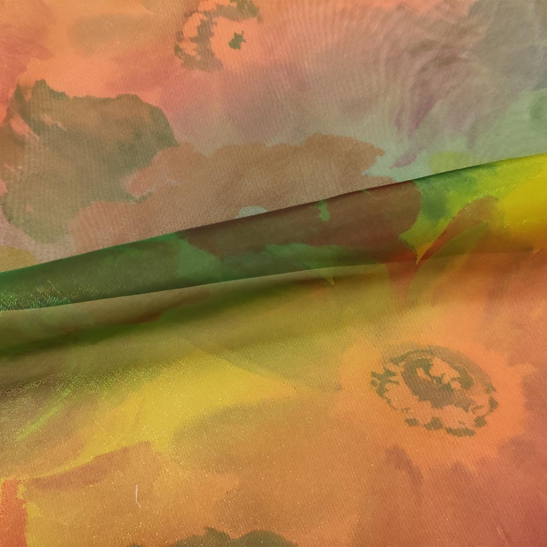 Tessuto Organza a fantasia motivo floreale arancione – verde – giallo