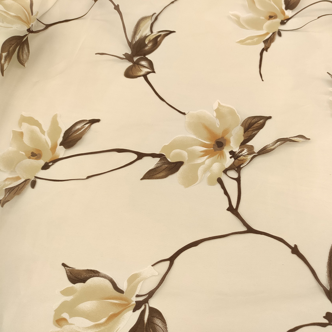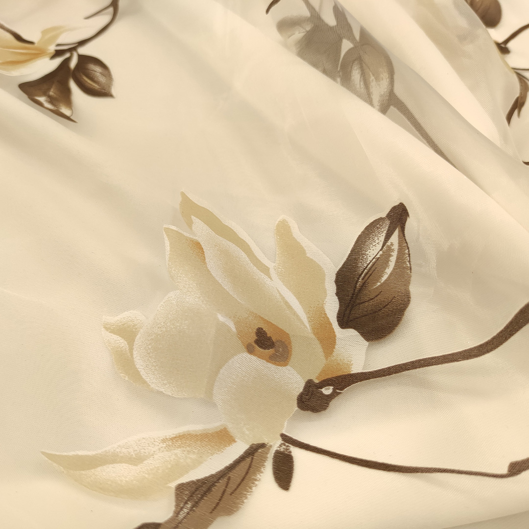 Tessuto Organza a fantasia motivo floreale bianco – tortora – marrone