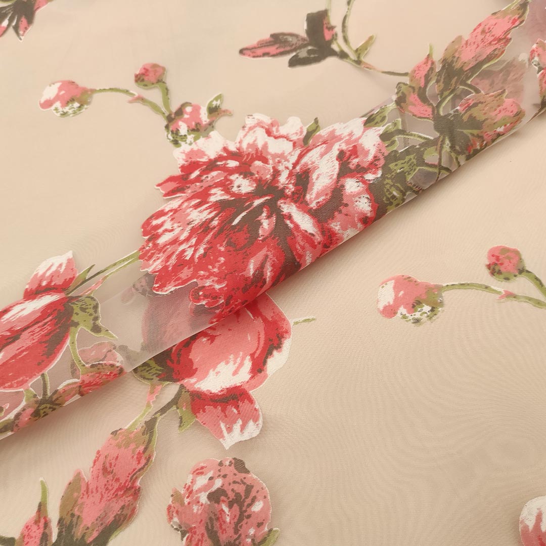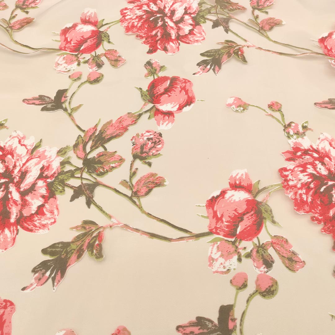 Tessuto Organza a fantasia motivo floreale corallo – bianco – tortora