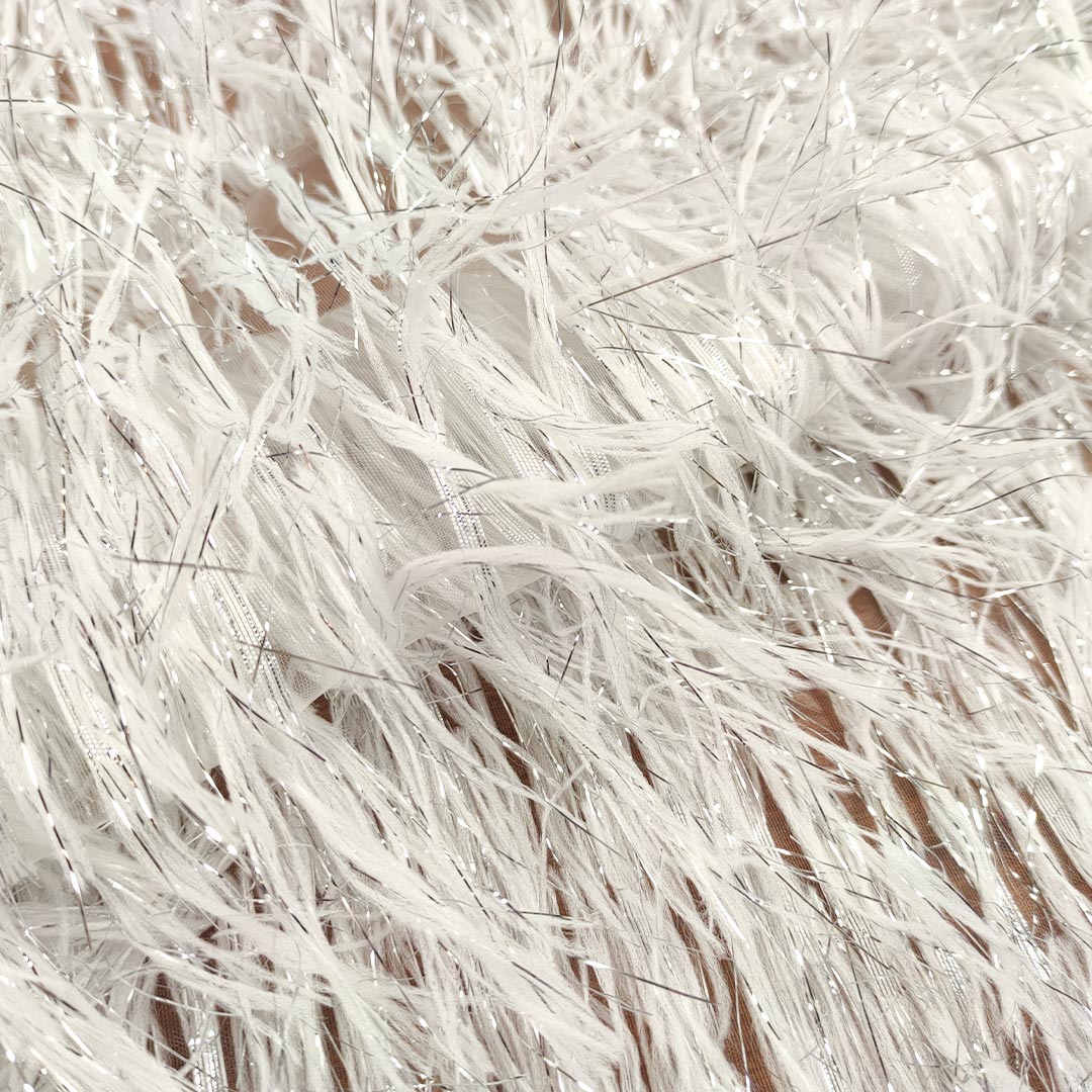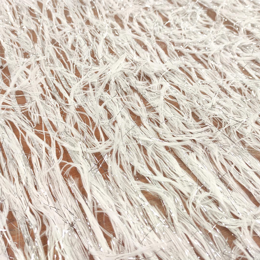 Tessuto organza con frange dalla mano lucida, semirigida, voluminosa e fluente, ideale per creare capi sartoriali da cerimonia e per le grandi occasioni originali e alla moda.