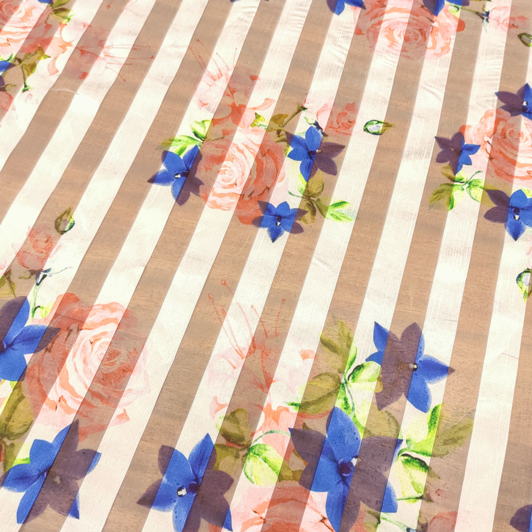 Tessuto Organza devorè a fantasia motivo floreale bianco – blu elettrico – arancione
