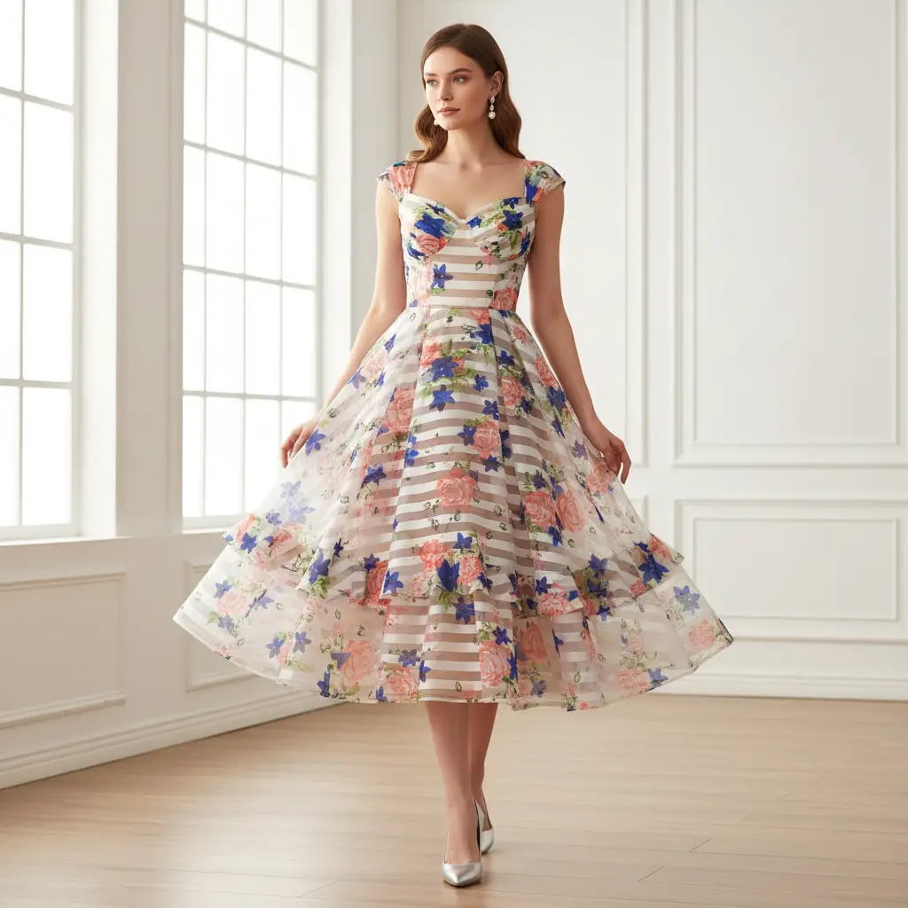 Tessuto Organza devorè dalla mano corposa e vaporosa, si presta alla creazione di capi esclusivi e ricercati da cerimonia o Prêt-à-porter come: gonne, abiti e bluse.