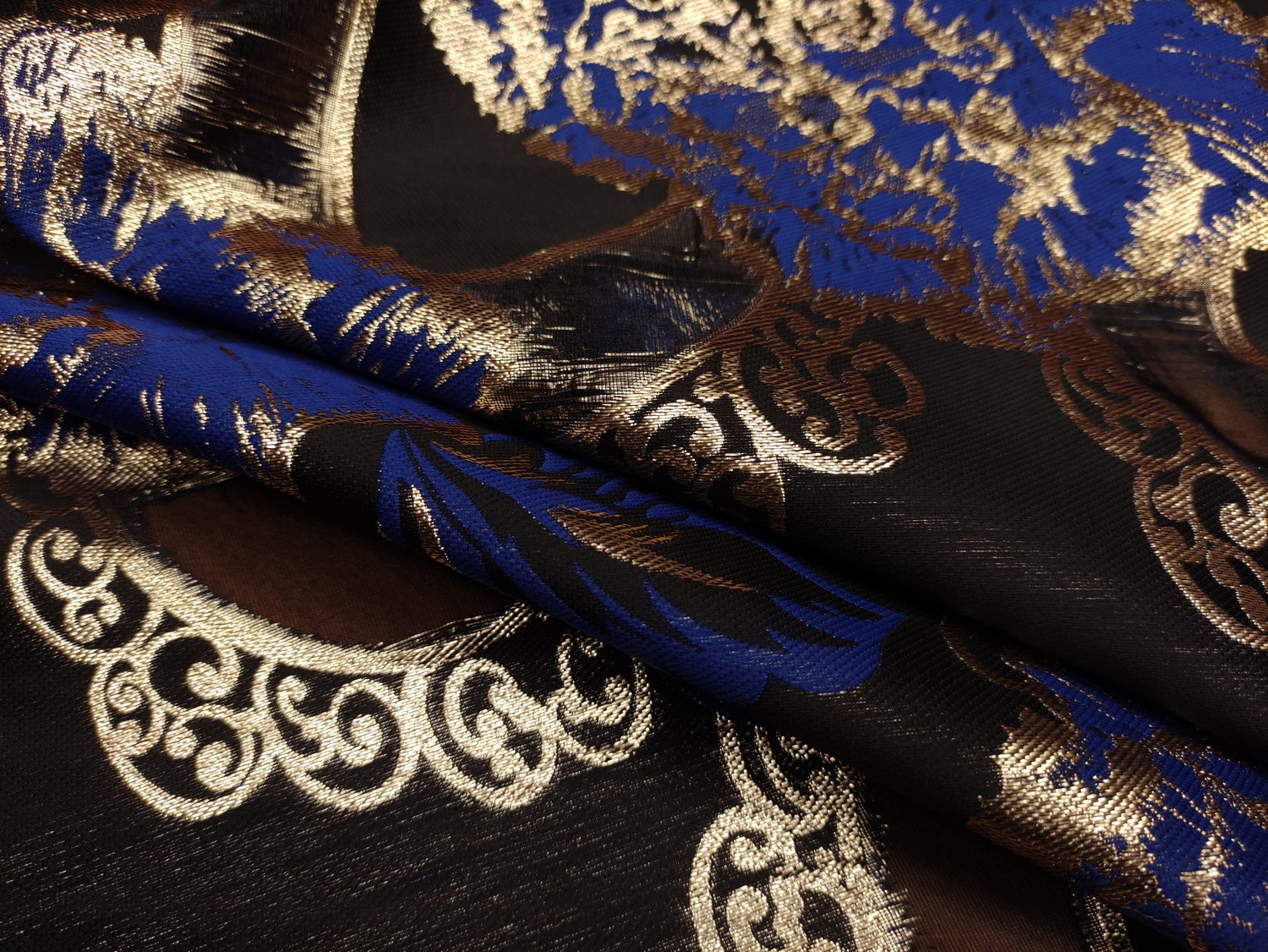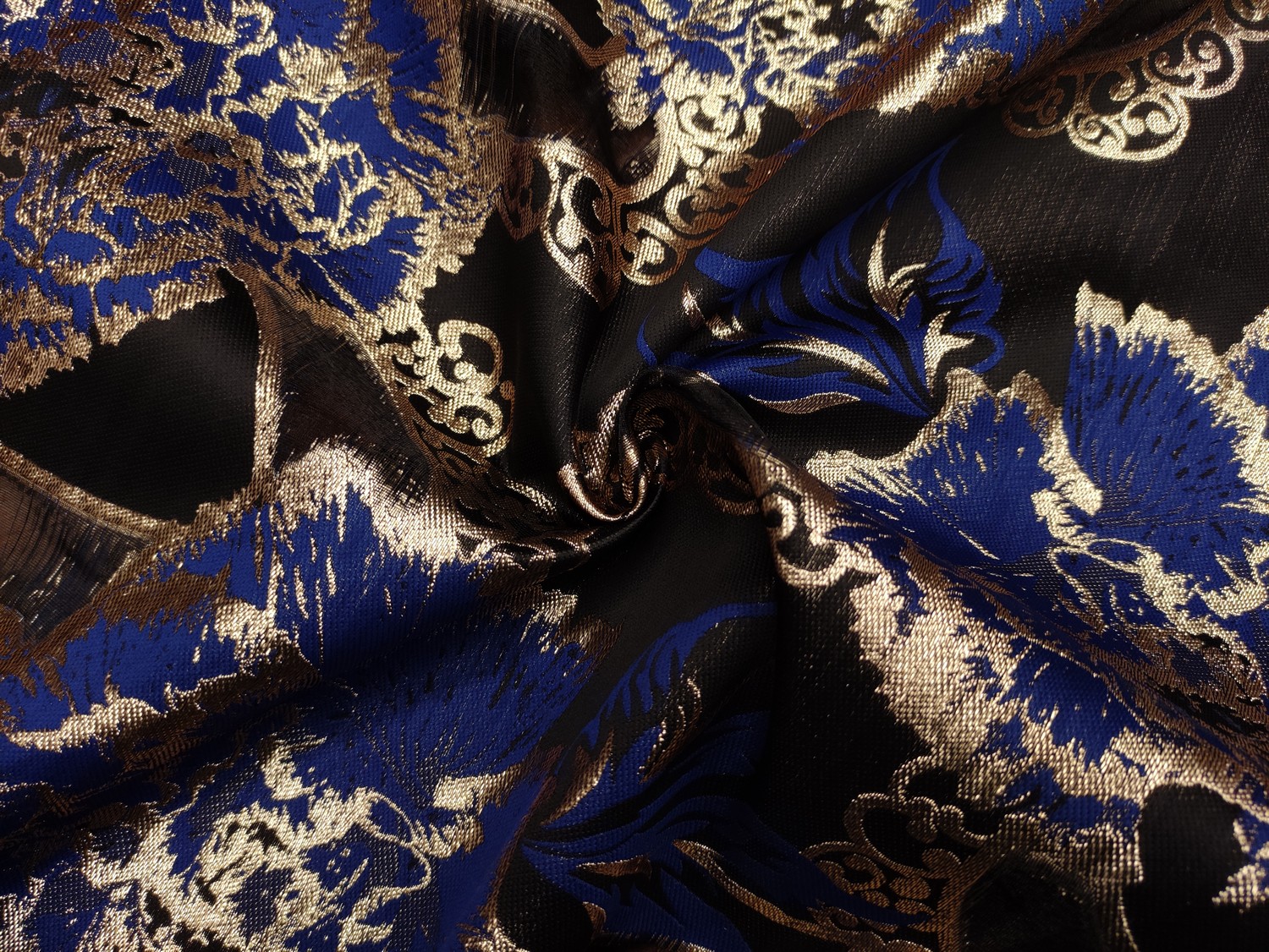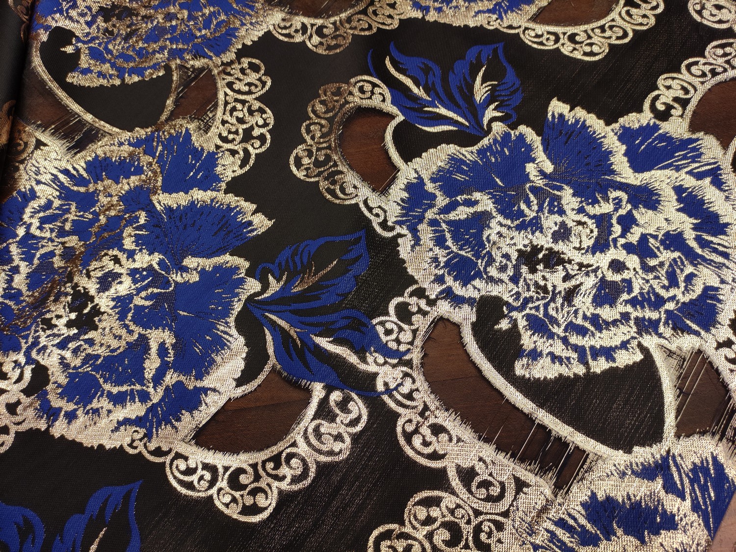 Tessuto Organza jacquard motivo floreale blu elettrico – oro – nero