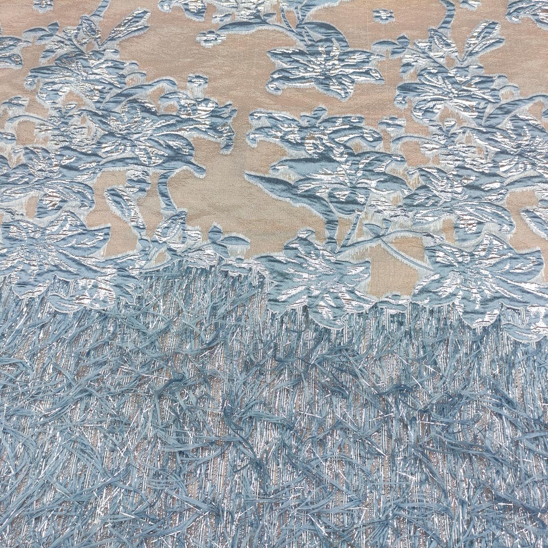 Tessuto organza jacquard motivo floreale con frange lurex dalla mano lucida, semirigida, voluminosa e fluente, ideale per creare capi sartoriali da cerimonia e per le grandi occasioni originali e alla moda.