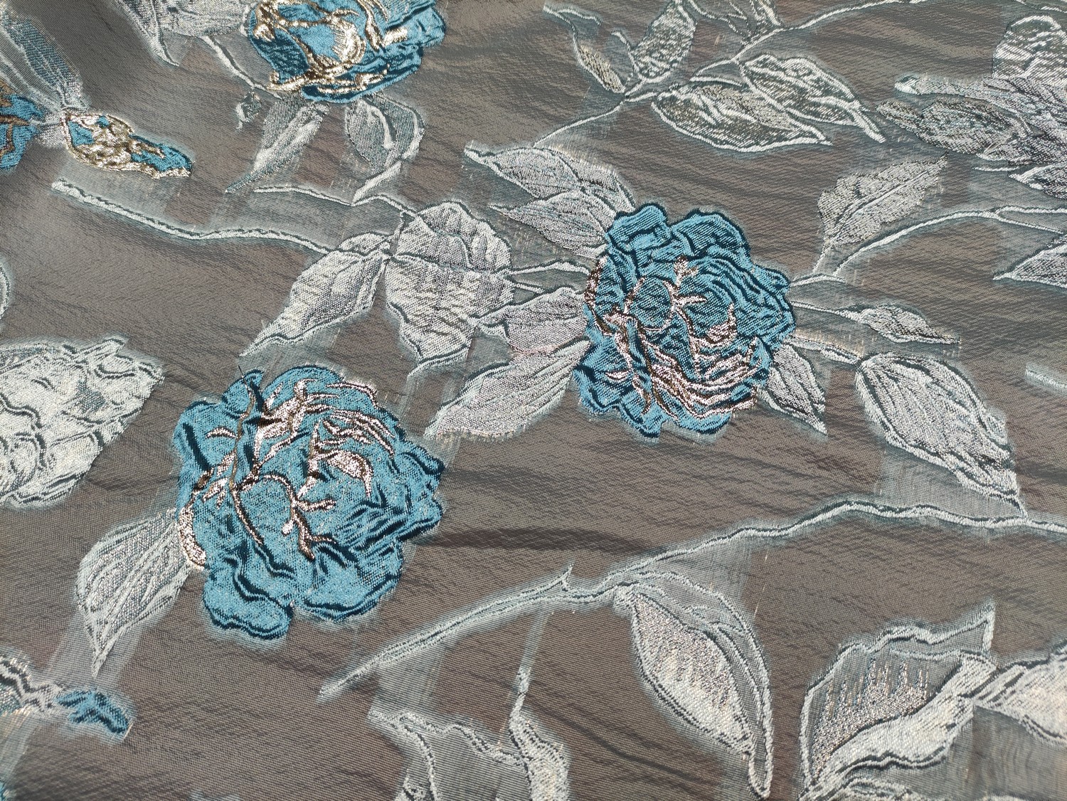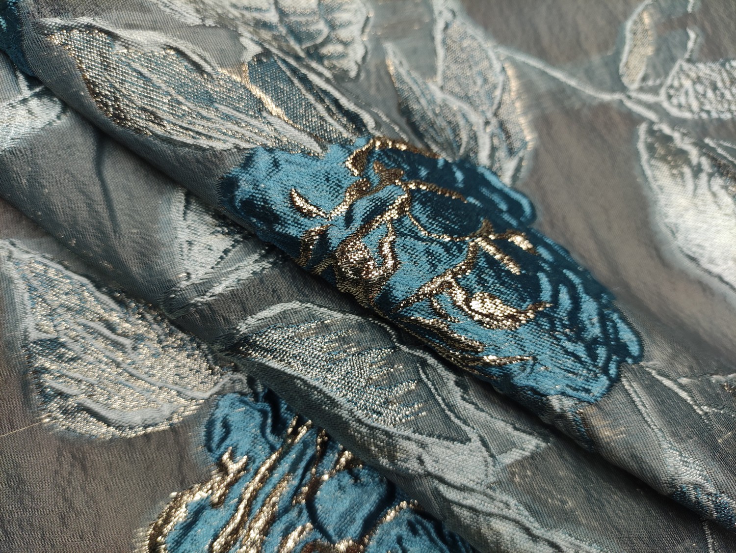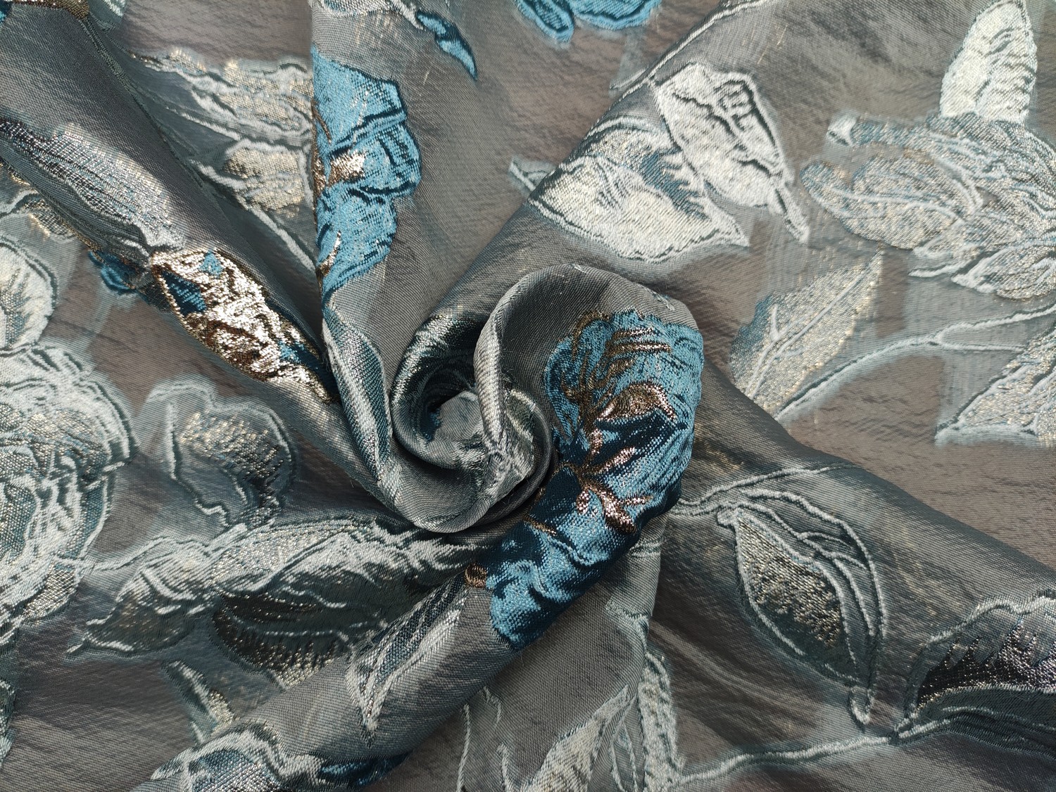 Tessuto Organza jacquard motivo floreale grigio – verde ottanio – oro