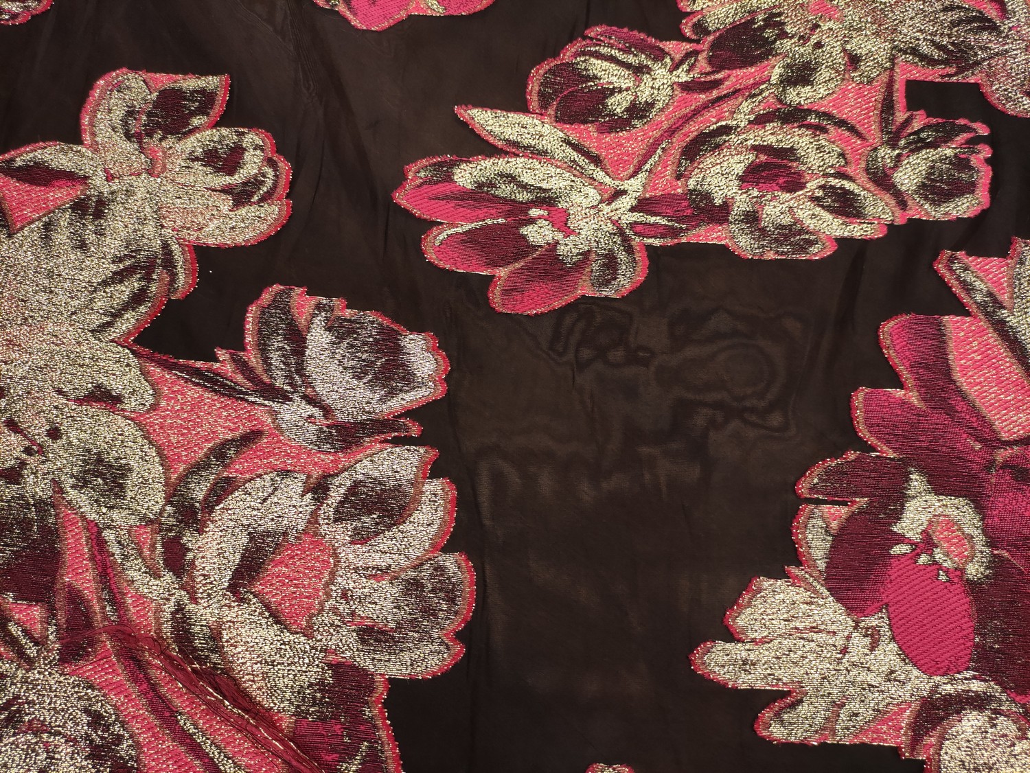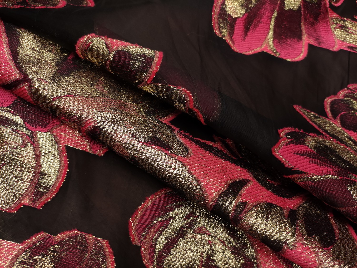 Tessuto Organza jacquard motivo floreale nero – oro – fucsia