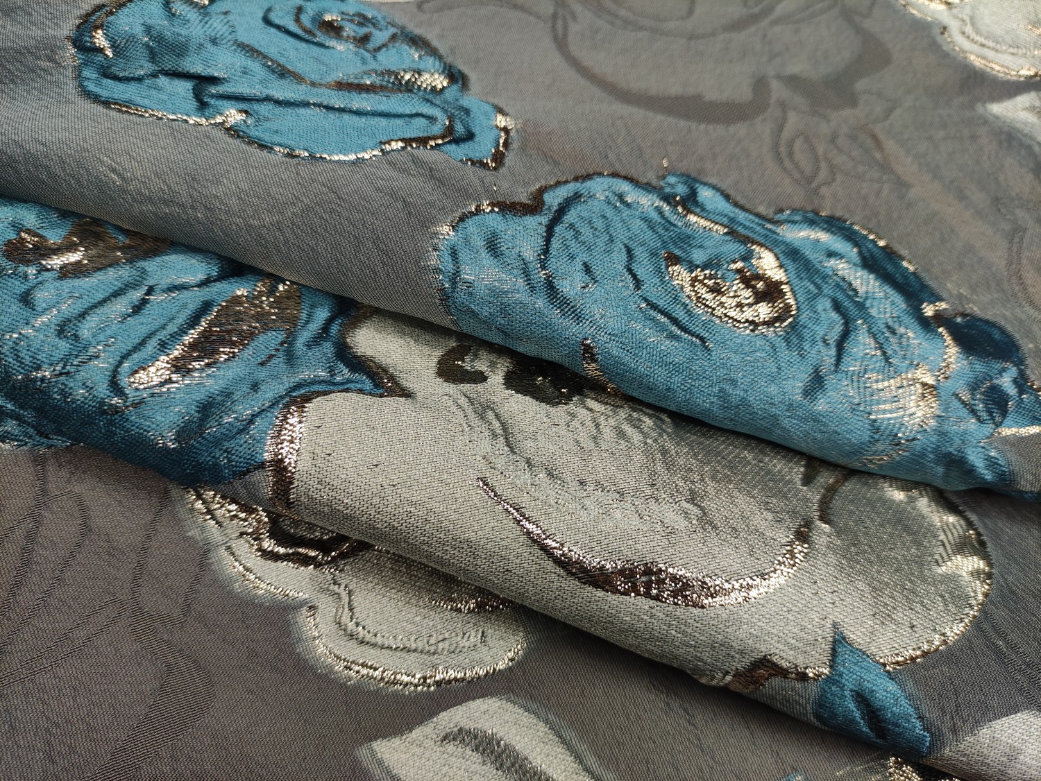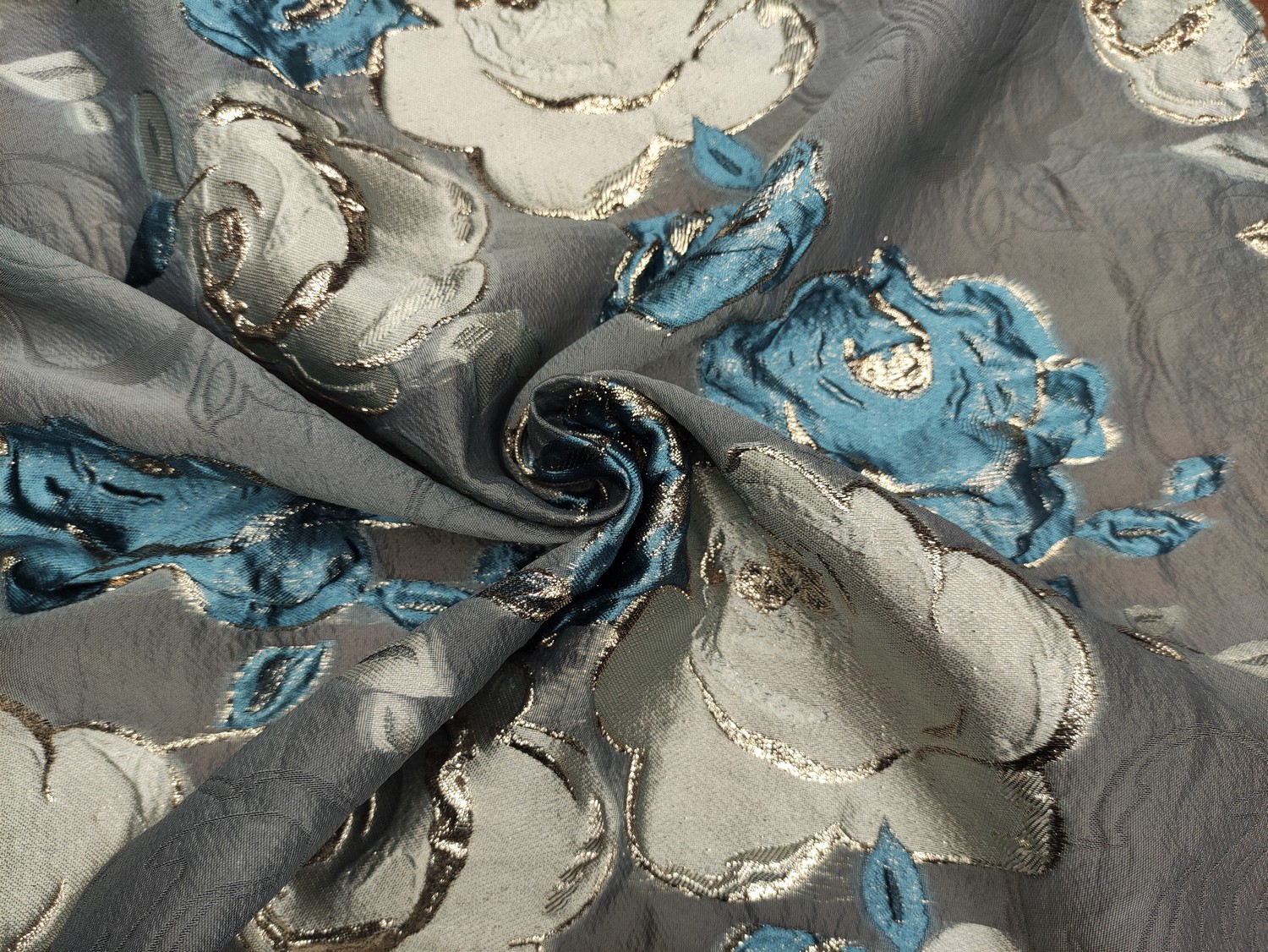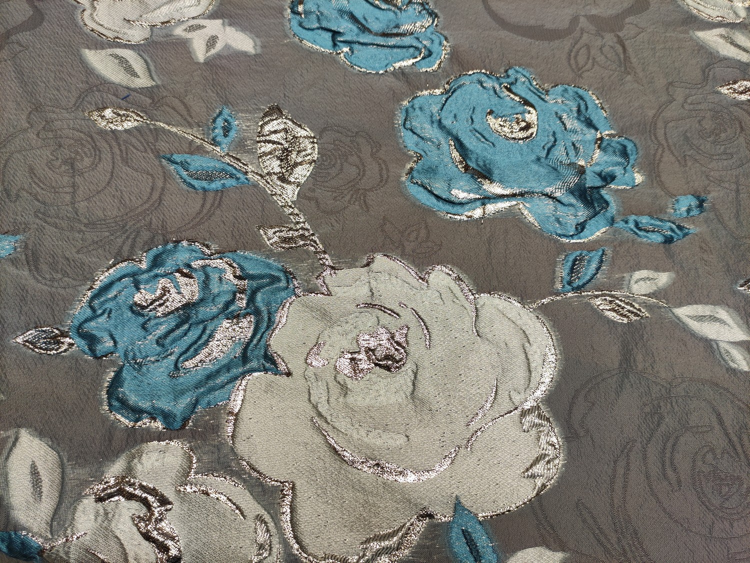 Tessuto Organza jacquard motivo floreale verde ottanio – oro – tortora