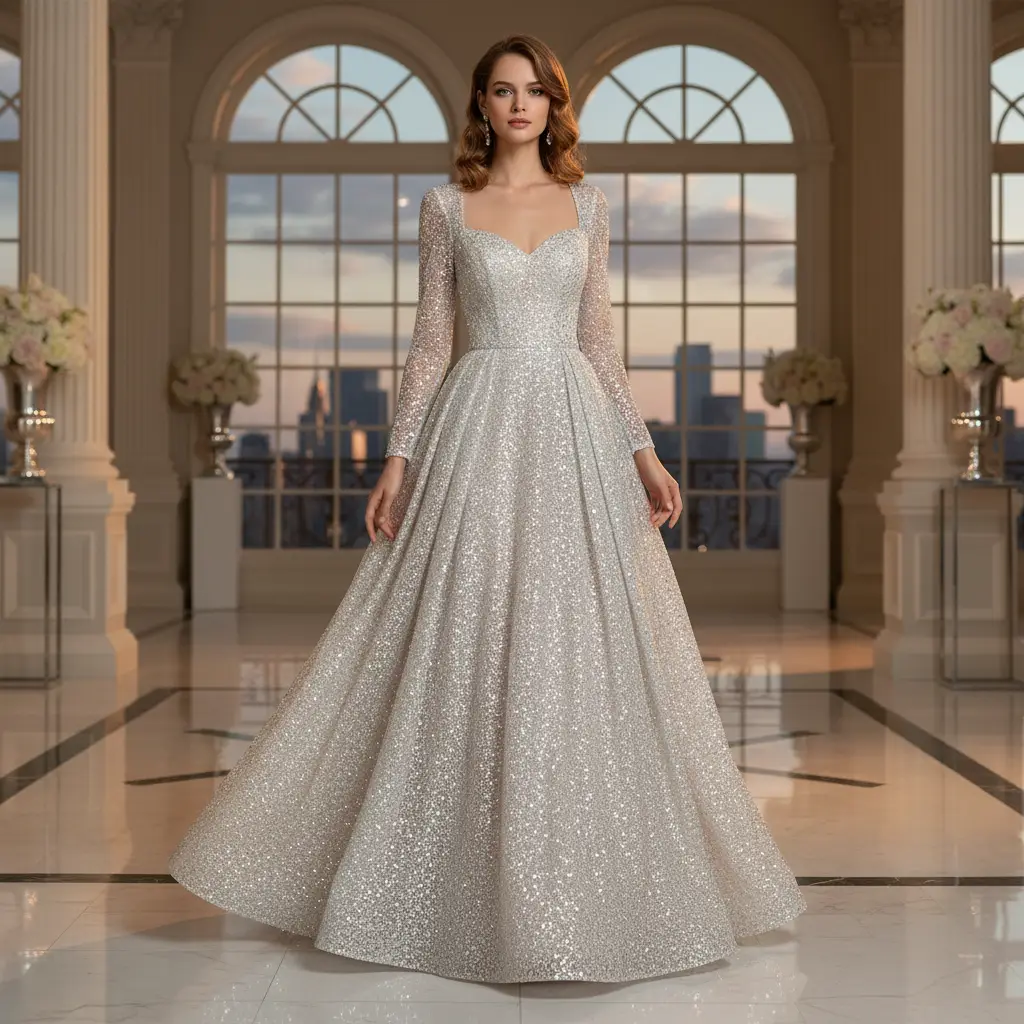 Tessuto glitter ricamato con paillettes ideale per creare capi eleganti e brillanti.