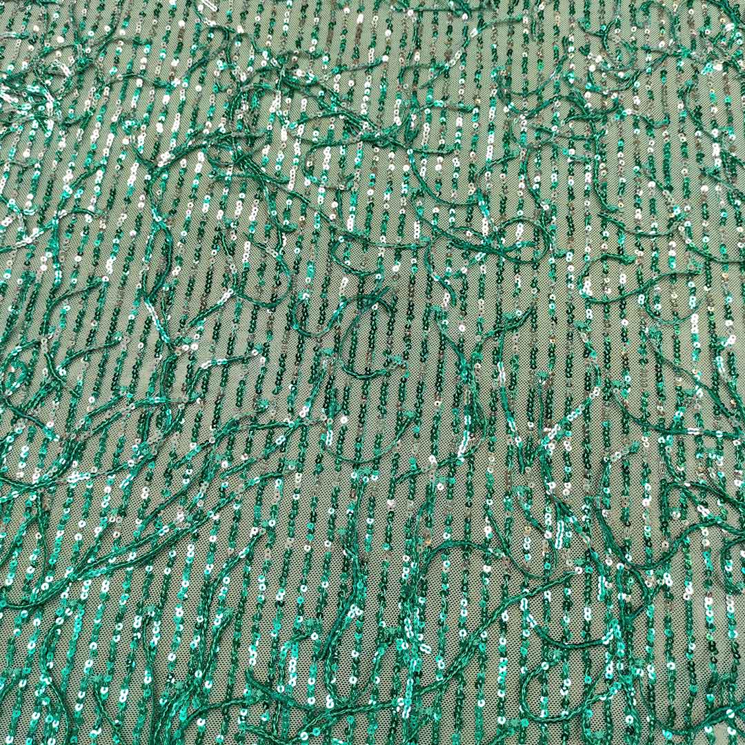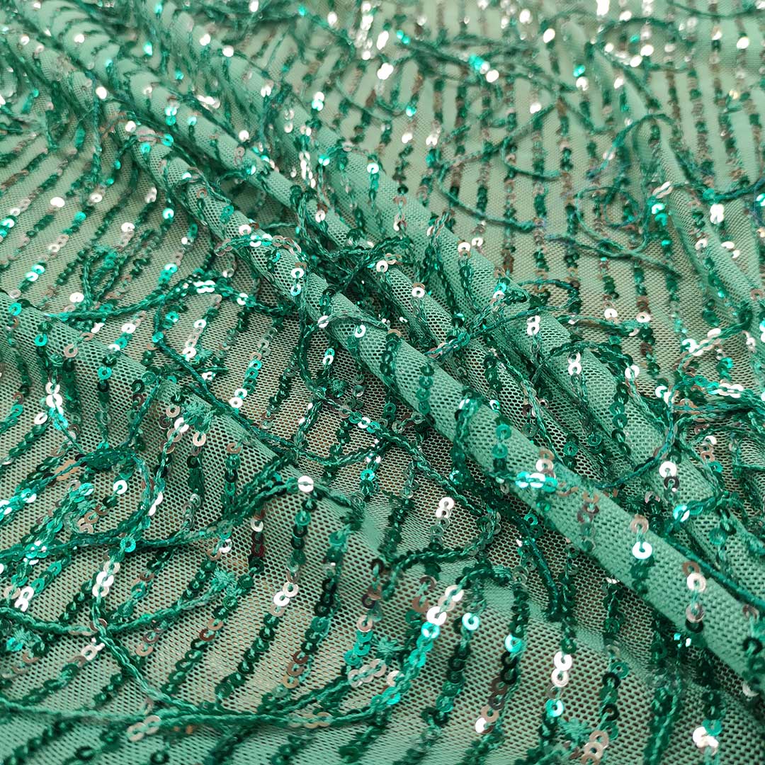 Tessuto Tulle Elasticizzato Ricamato con paillettes a frange motivo sfumato acquamarina – verde smeraldo
