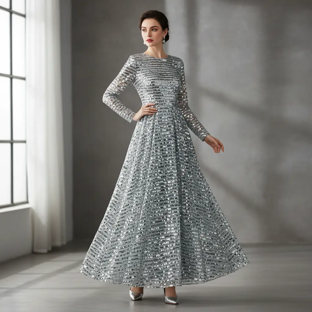 Tessuto Tulle elasticizzato ricamato con paillettes ideale per creare capi eleganti e brillanti.