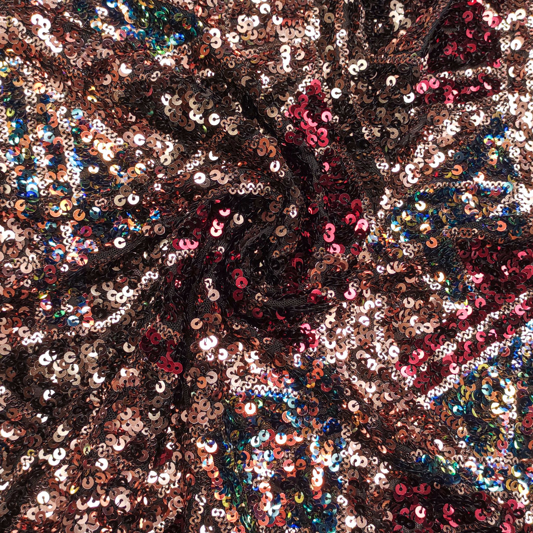 Tessuto Tulle elasticizzato ricamato con paillettes ideale per creare capi eleganti e brillanti.