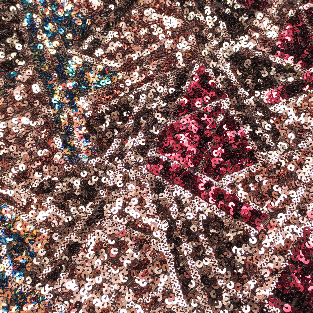 Tessuto Tulle Elasticizzato Ricamato con paillettes motivo astratto bordeaux – cipria – blu