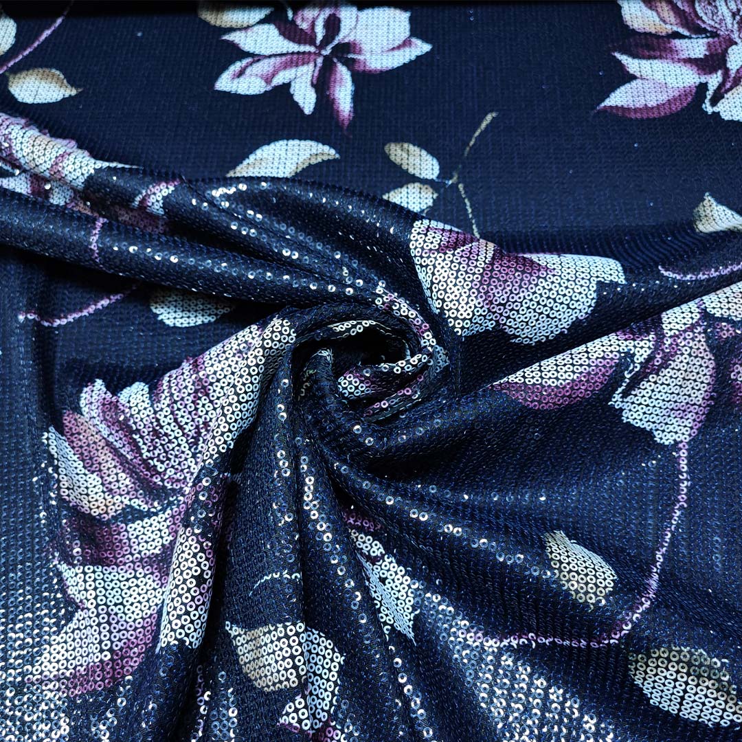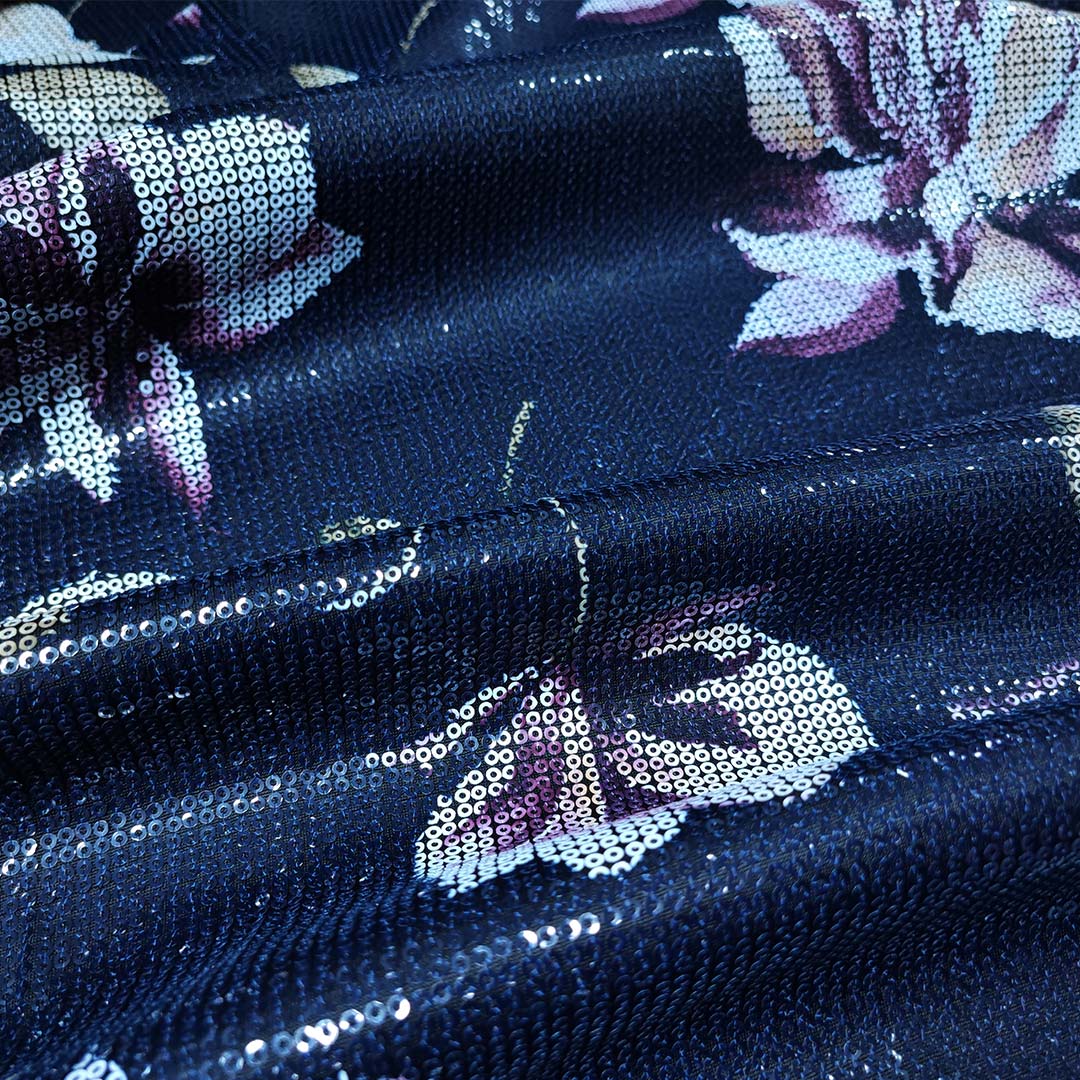 Tessuto Tulle Elasticizzato Ricamato con paillettes motivo floreale blu -vinaccio – beige