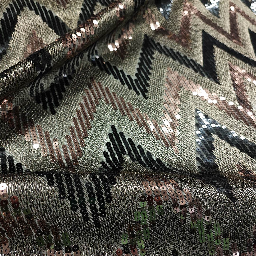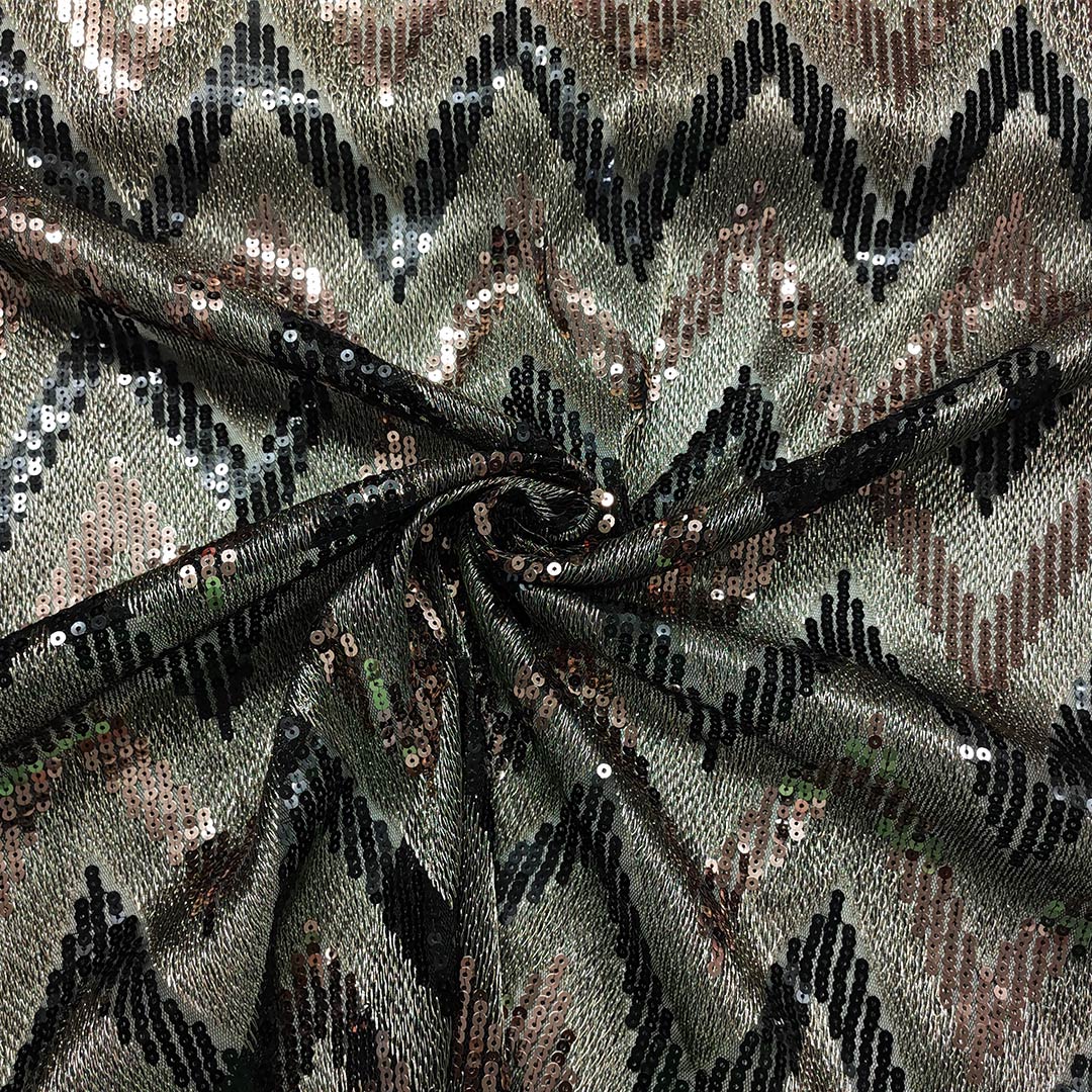 Tessuto Tulle elasticizzato ricamato con paillettes ideale per creare capi eleganti e brillanti.