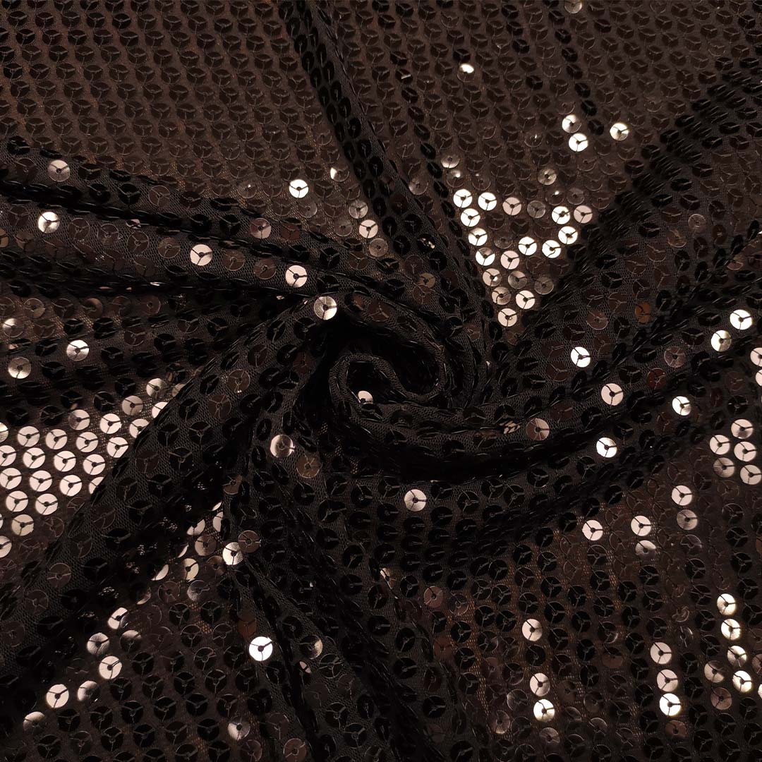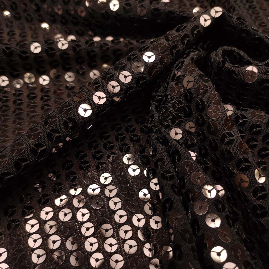 Tessuto Tulle elasticizzato ricamato con paillettes ideale per creare capi eleganti e brillanti.