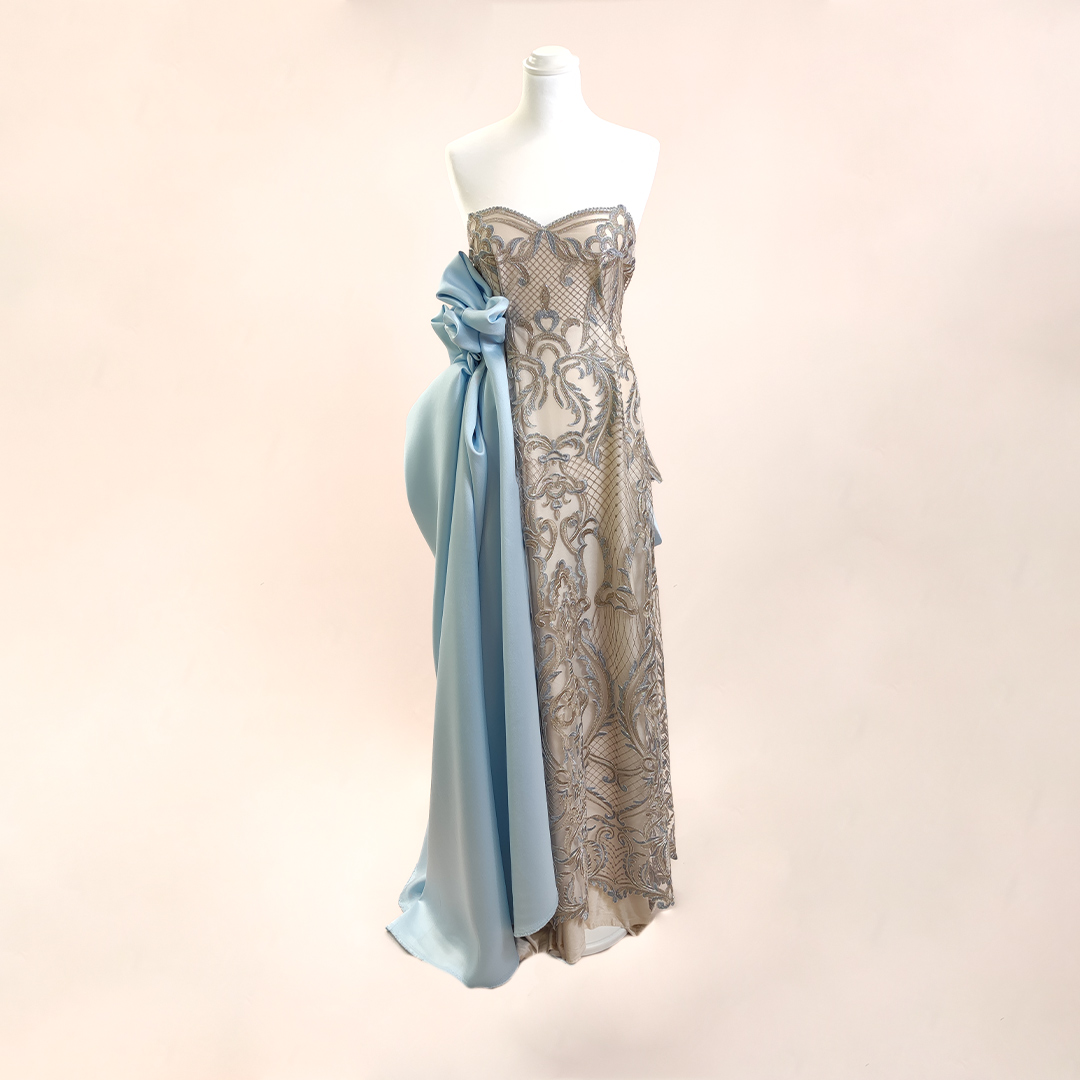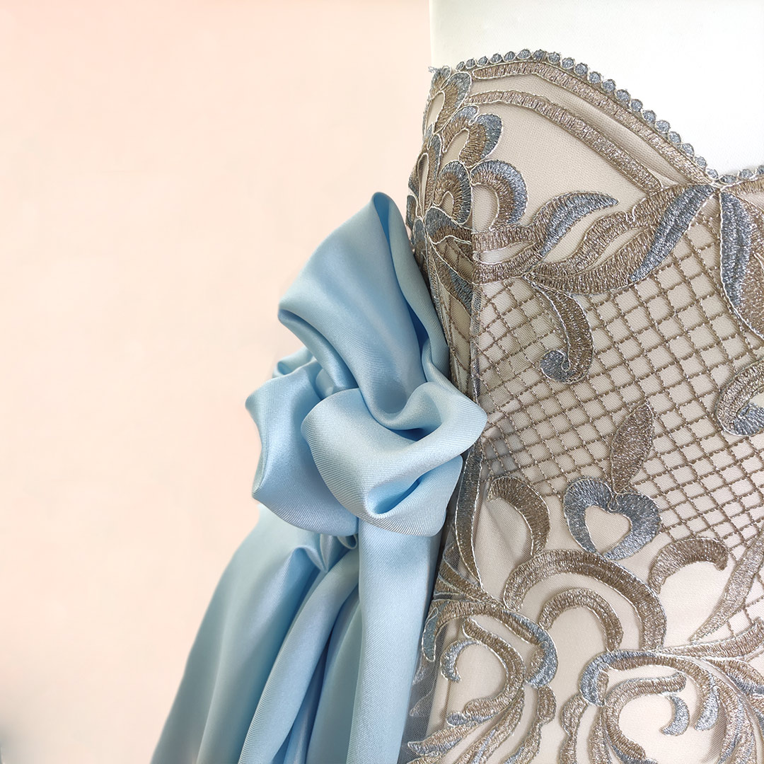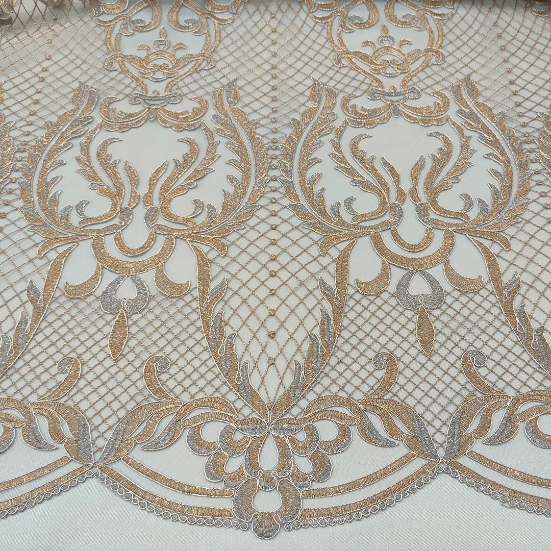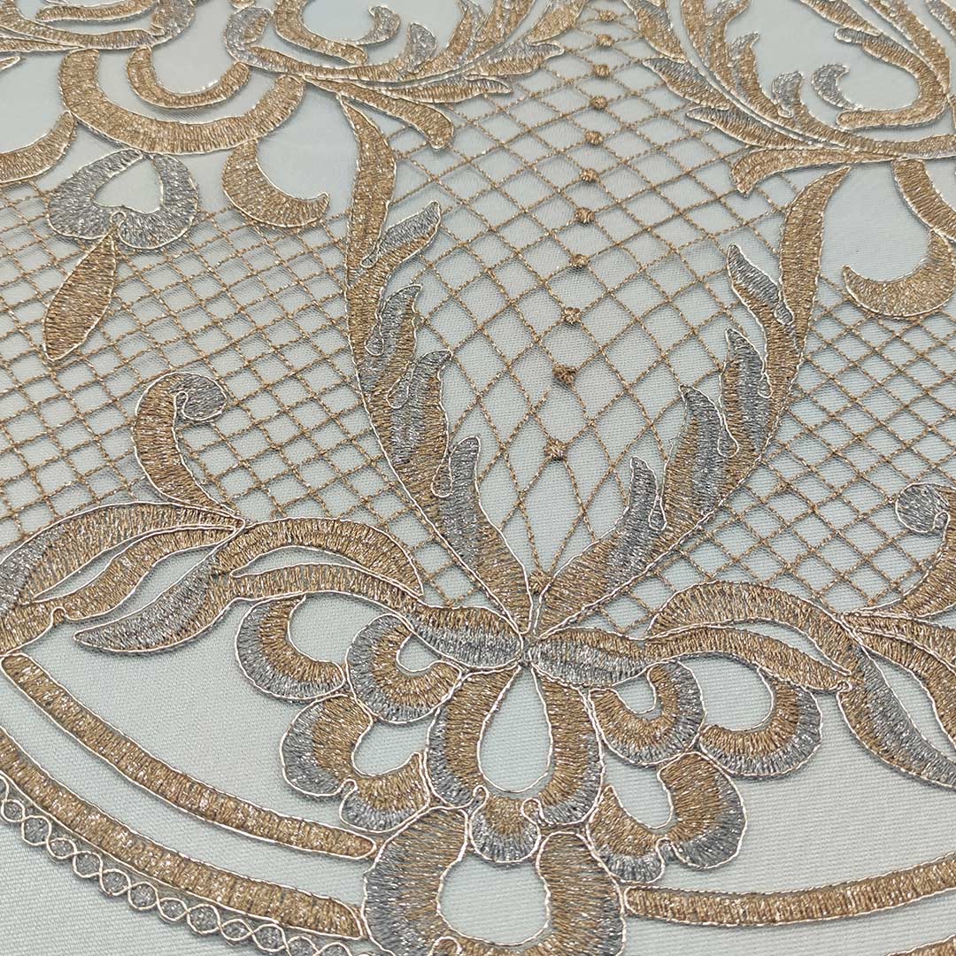 Tessuto Tulle – pizzo mano seta ricamato motivo floreale barocco celeste – oro