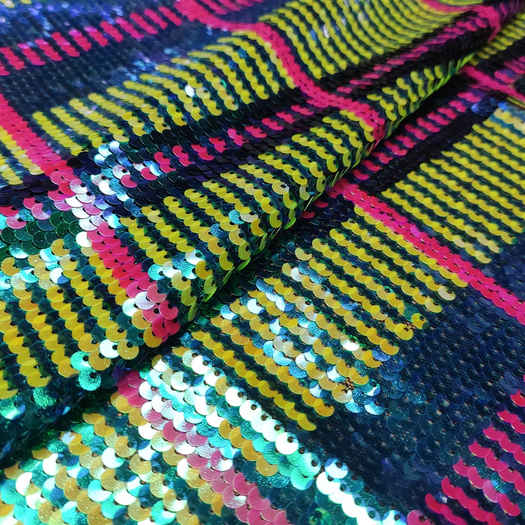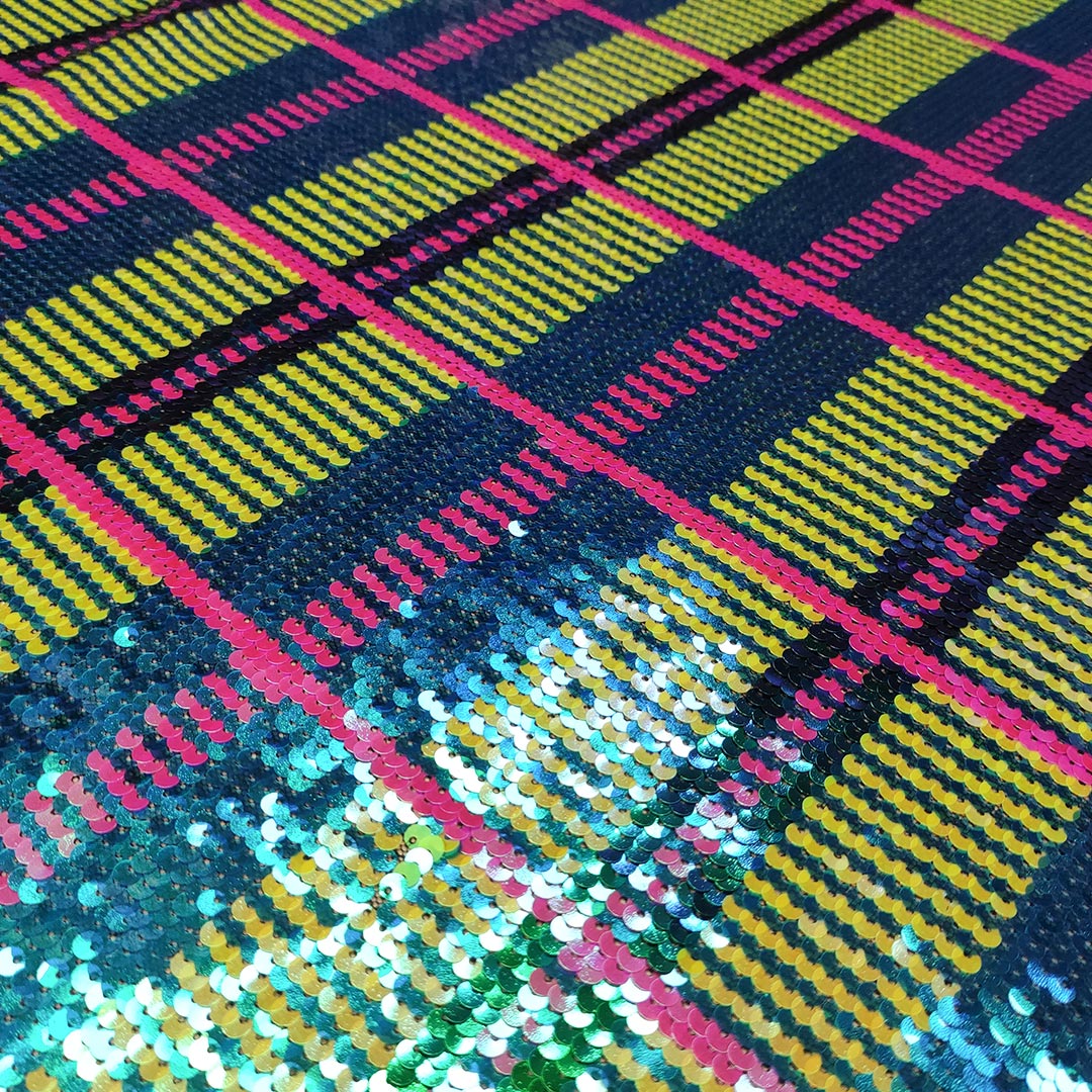 Tessuto Tulle ricamato con paillettes motivo geometrico giallo fluo – fucsia – bluette