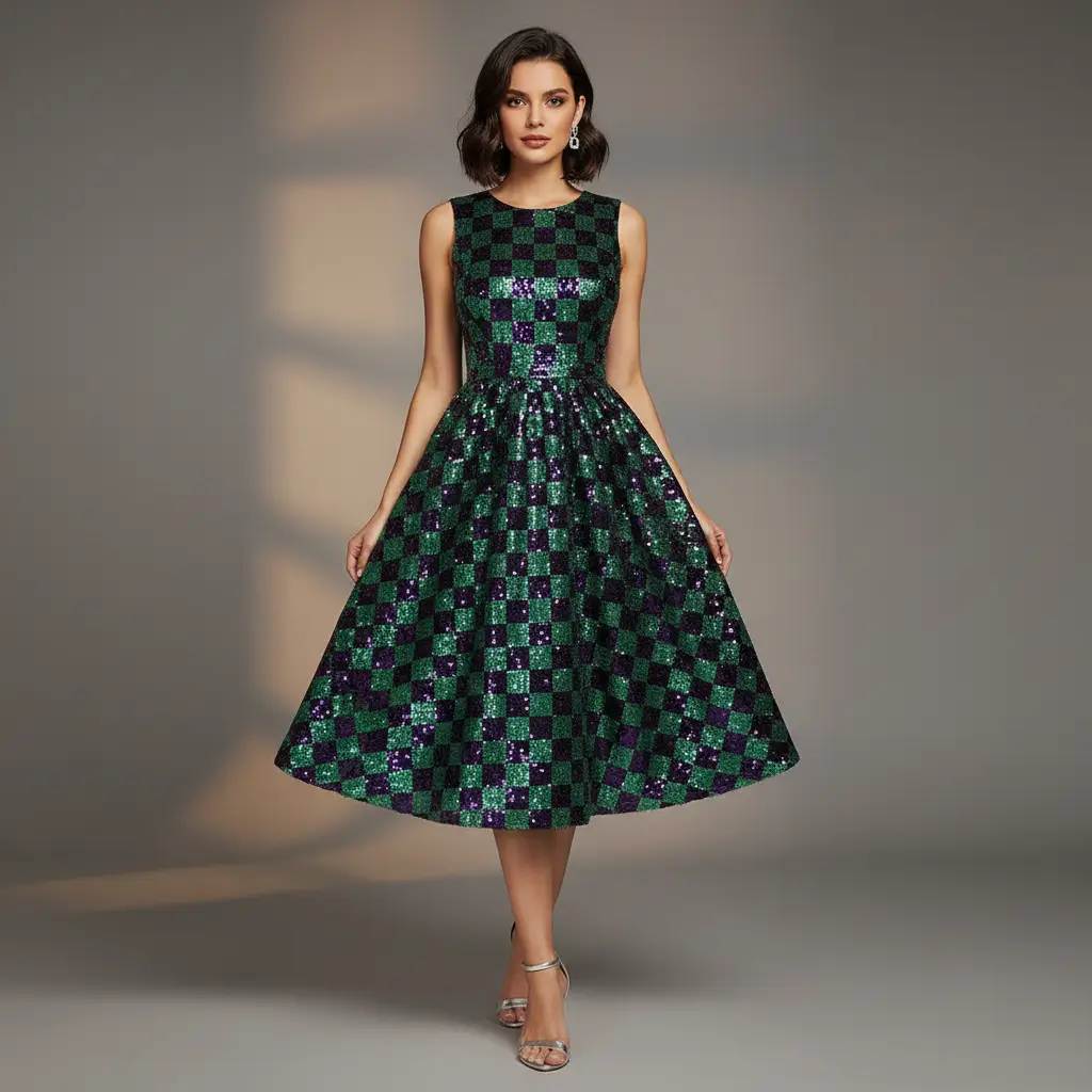 Tessuto Tulle ricamato con paillettes motivo quadri viola – verde smeraldo