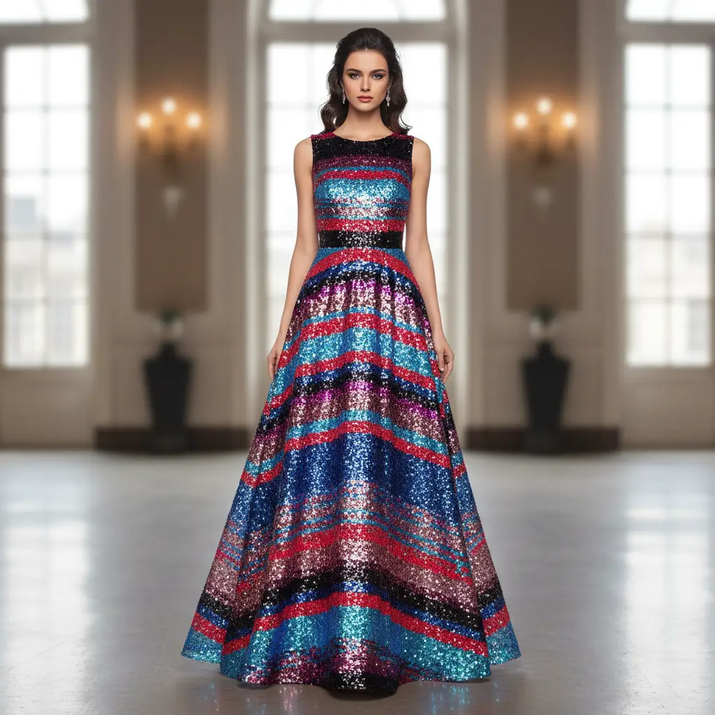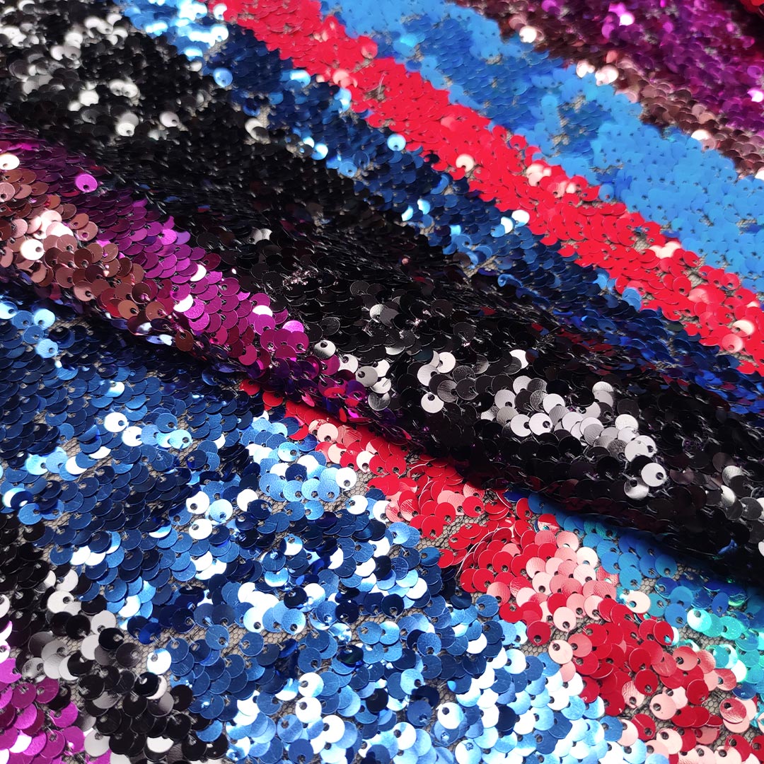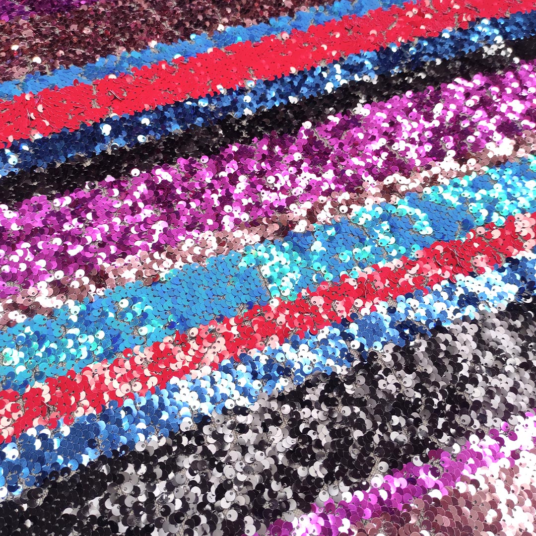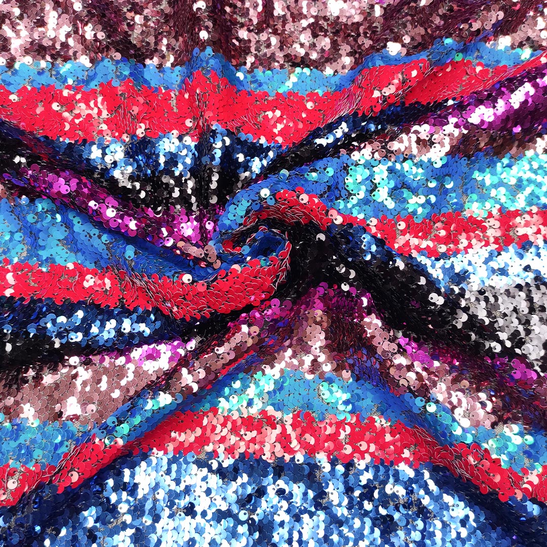 Tessuto Tulle ricamato con paillettes motivo rigato azzurro – fucsia – rosso – rosa