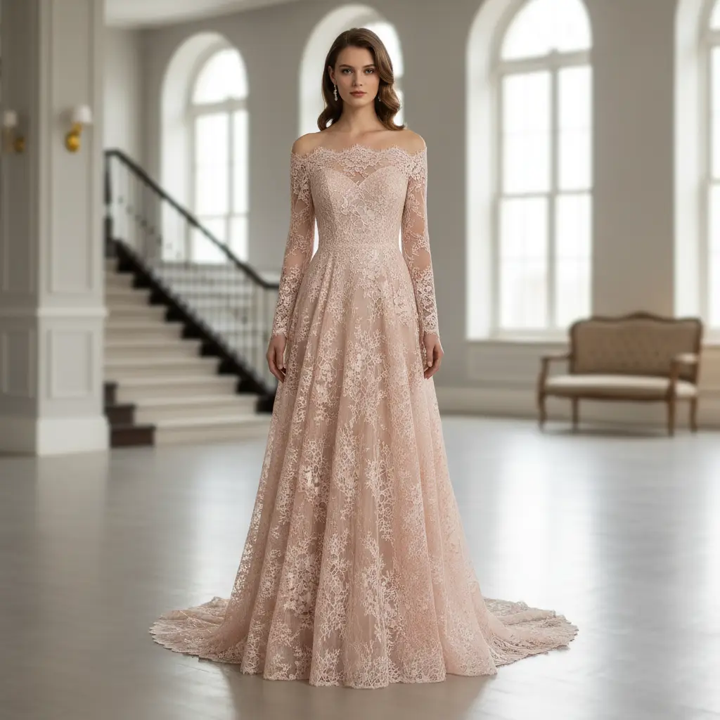 Tessuto pizzo chantilly motivo floreale rosa cipria
