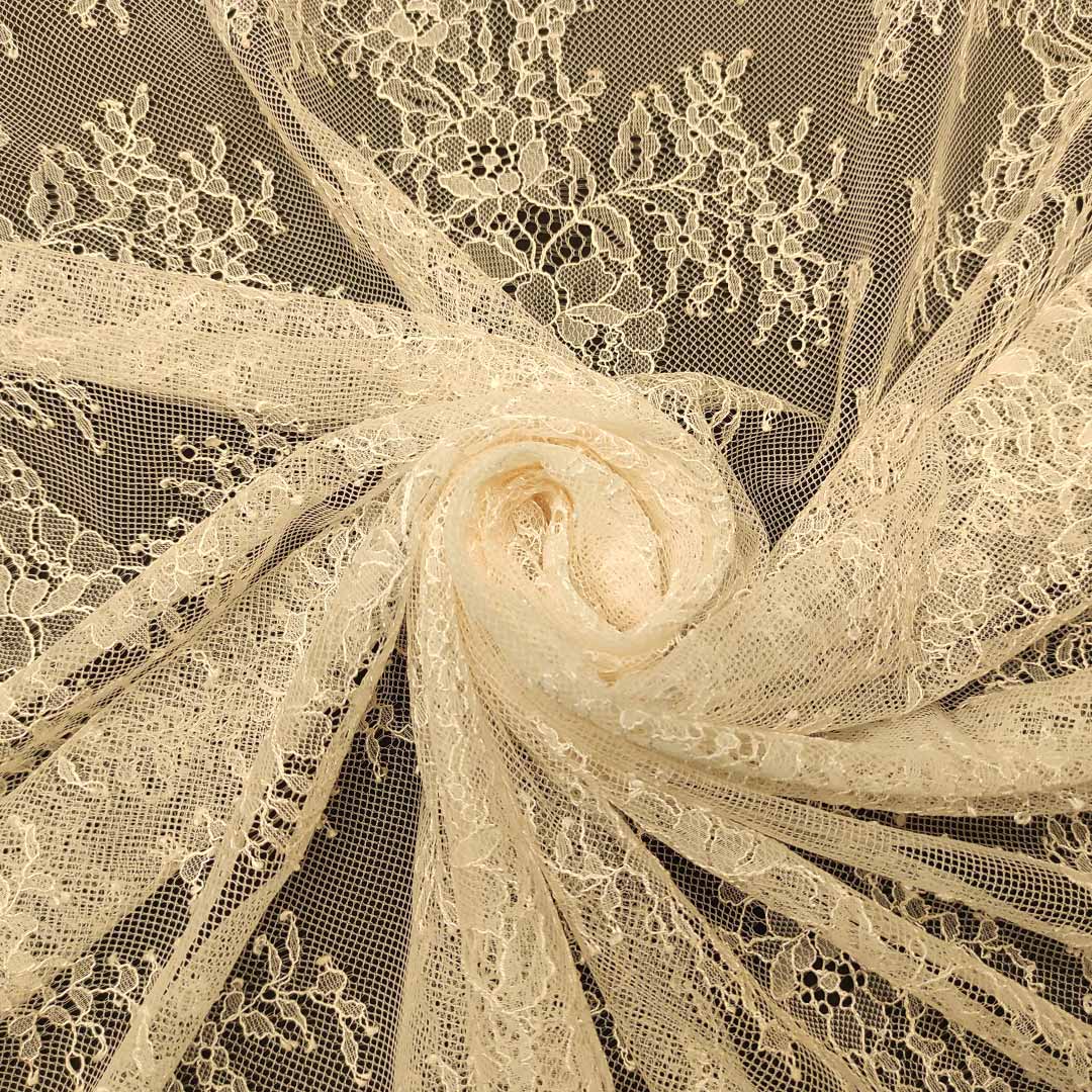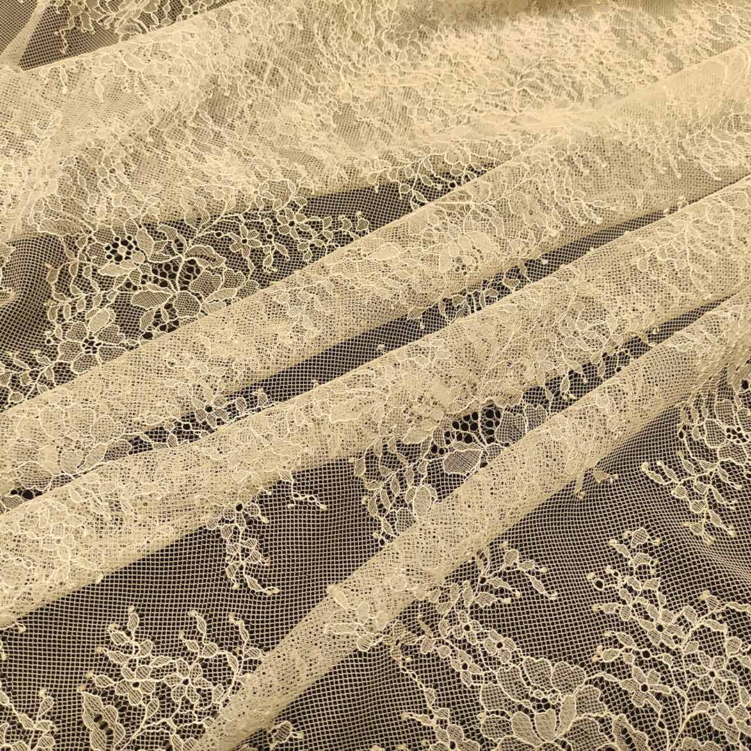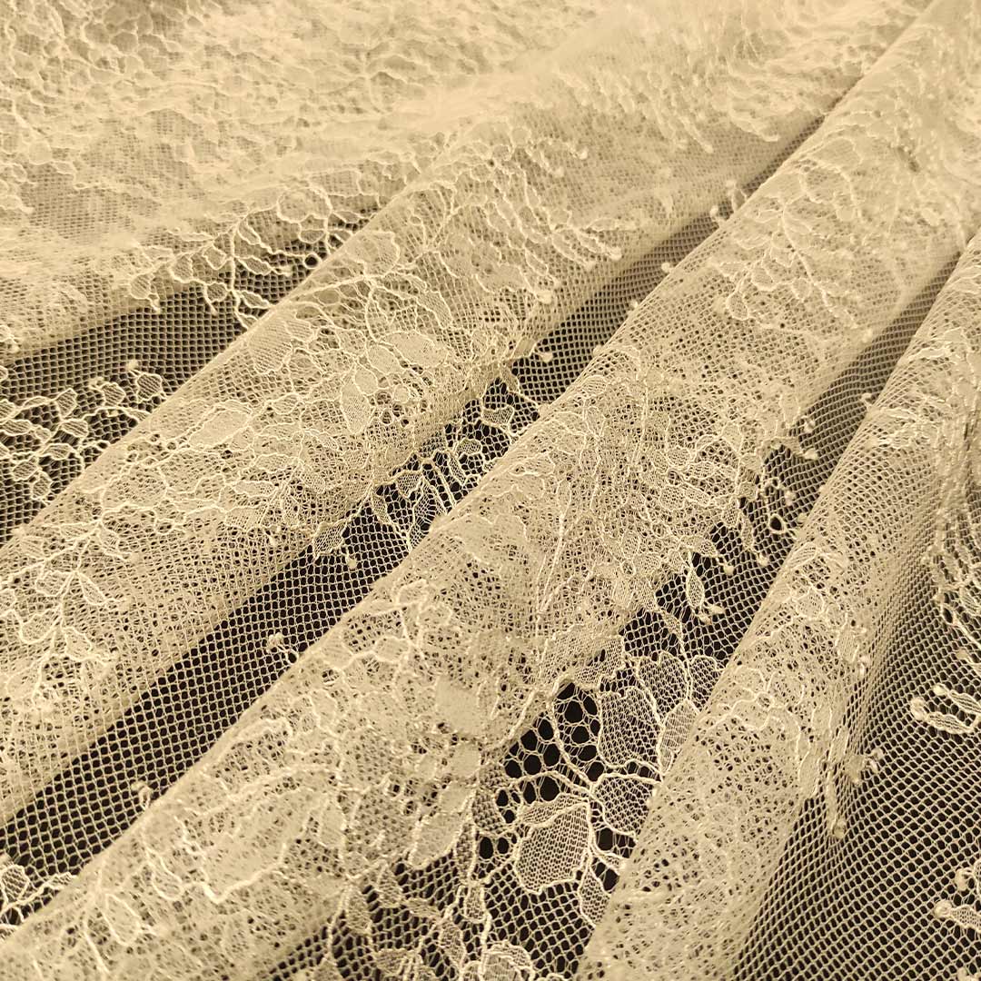 Tessuto Pizzo Chantilly dalla mano morbida e leggera, ideale per realizzare capi da cerimonia e per le grandi occasioni.