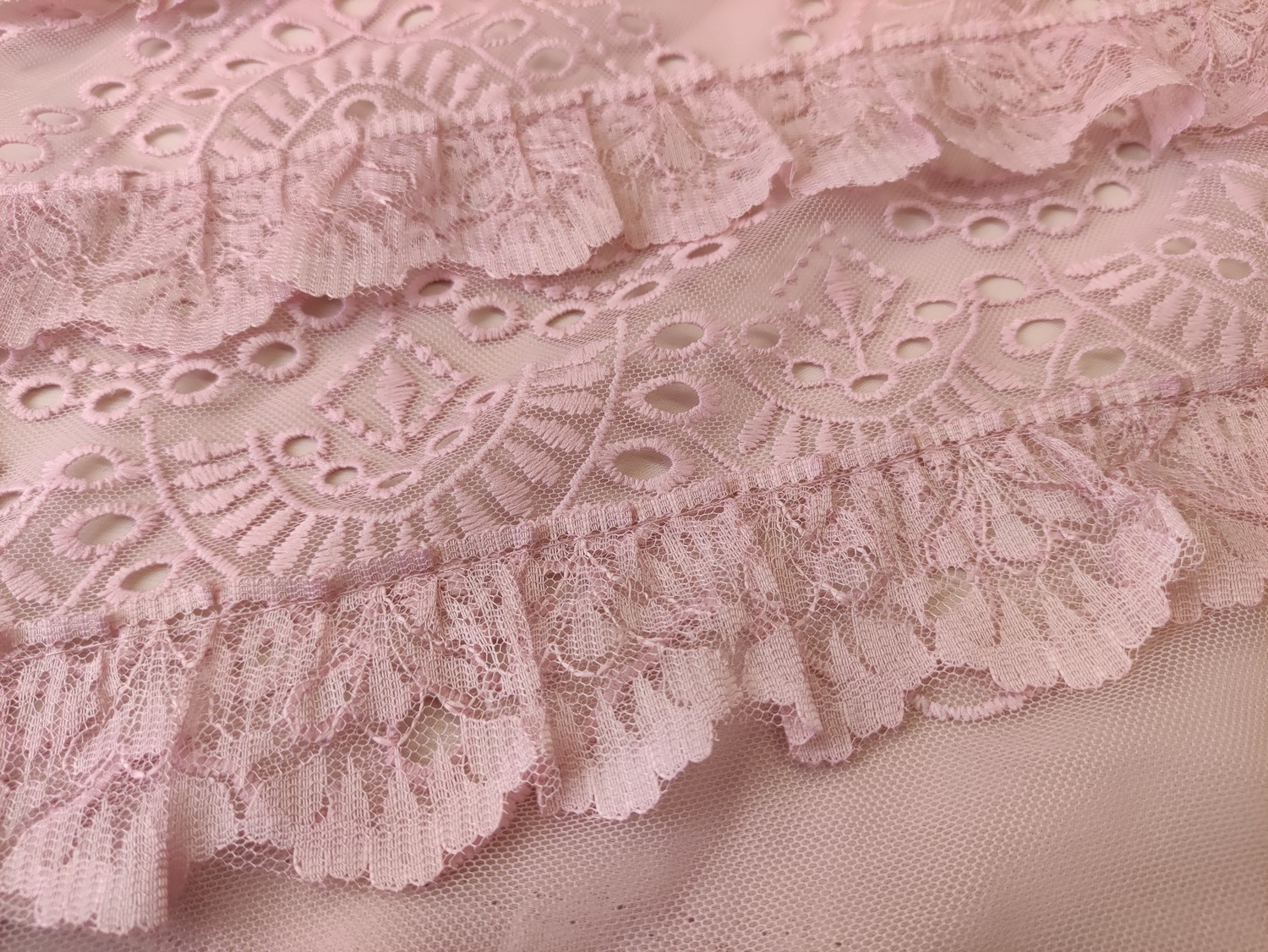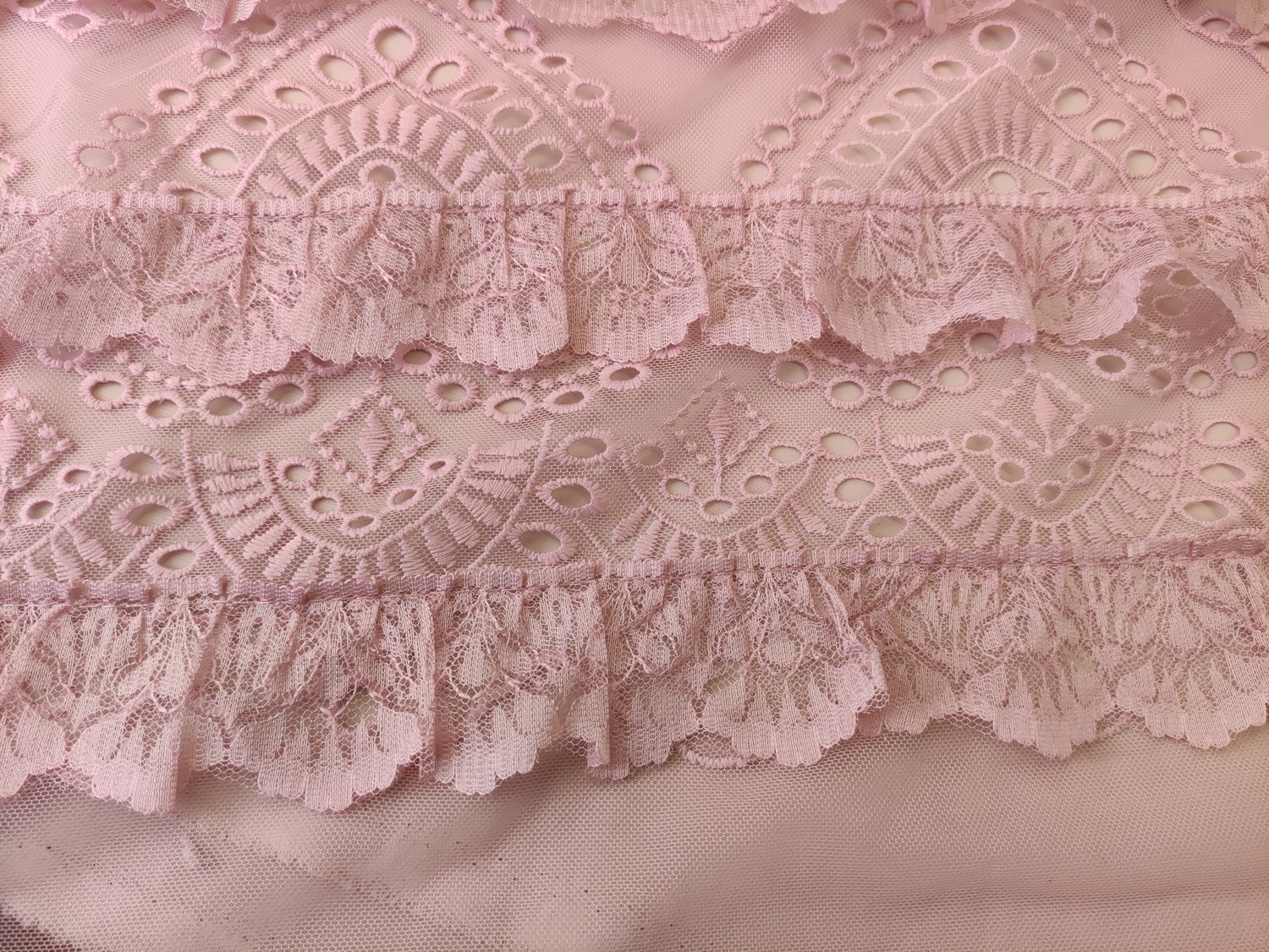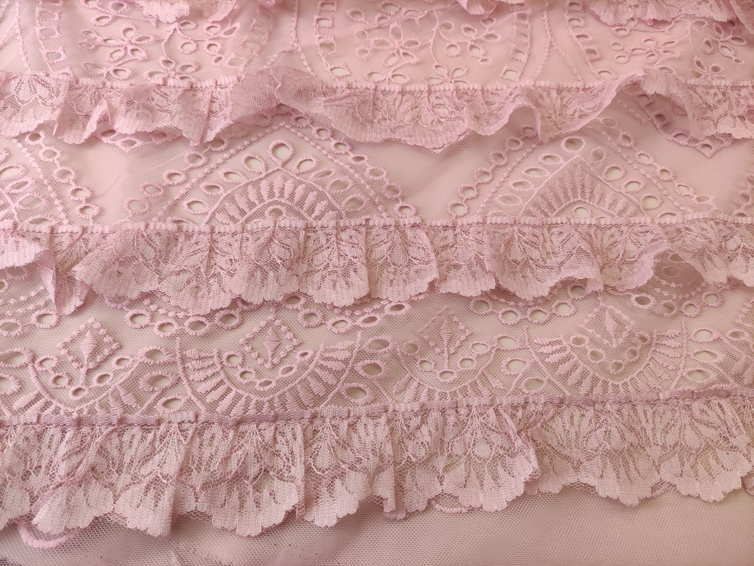 Tessuto pizzo macramè ricamato con balze in pizzo dalla mano morbida e fluente, ideale per creare capi sartoriali da cerimonia e per le grandi occasioni originali e alla moda.