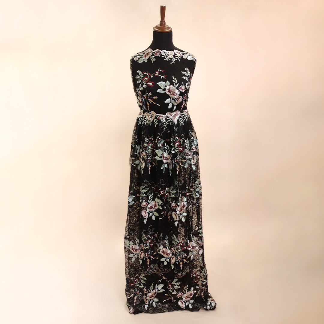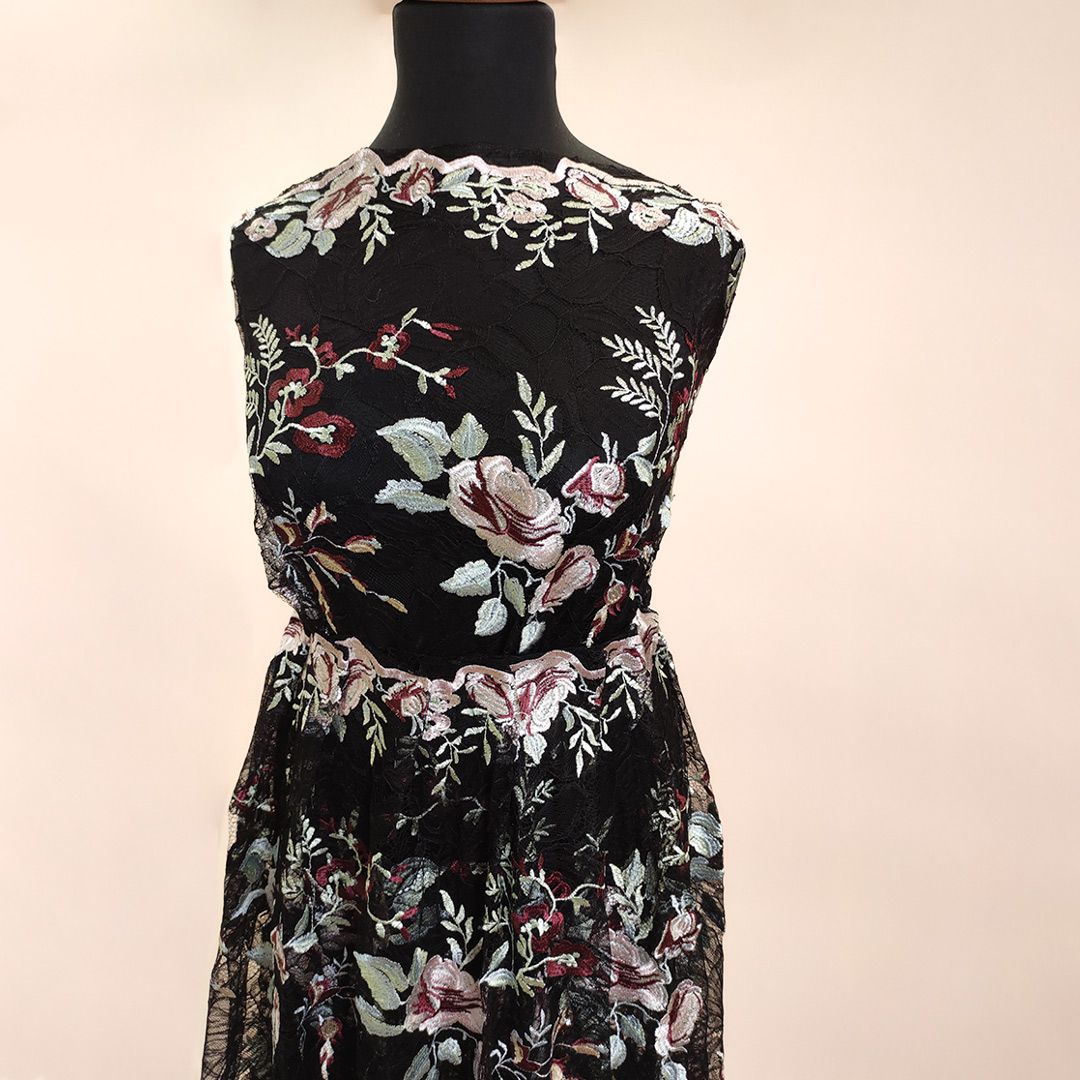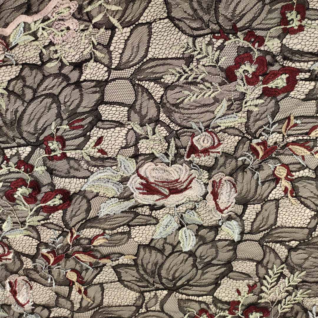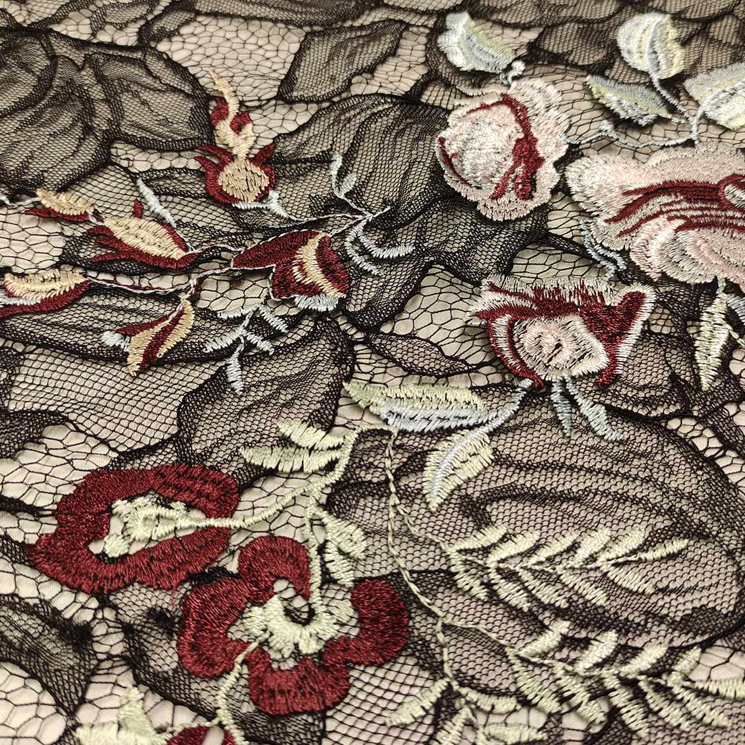 Tessuto Pizzo Macramè ricamato motivo floreale nero – bordeaux – verdino