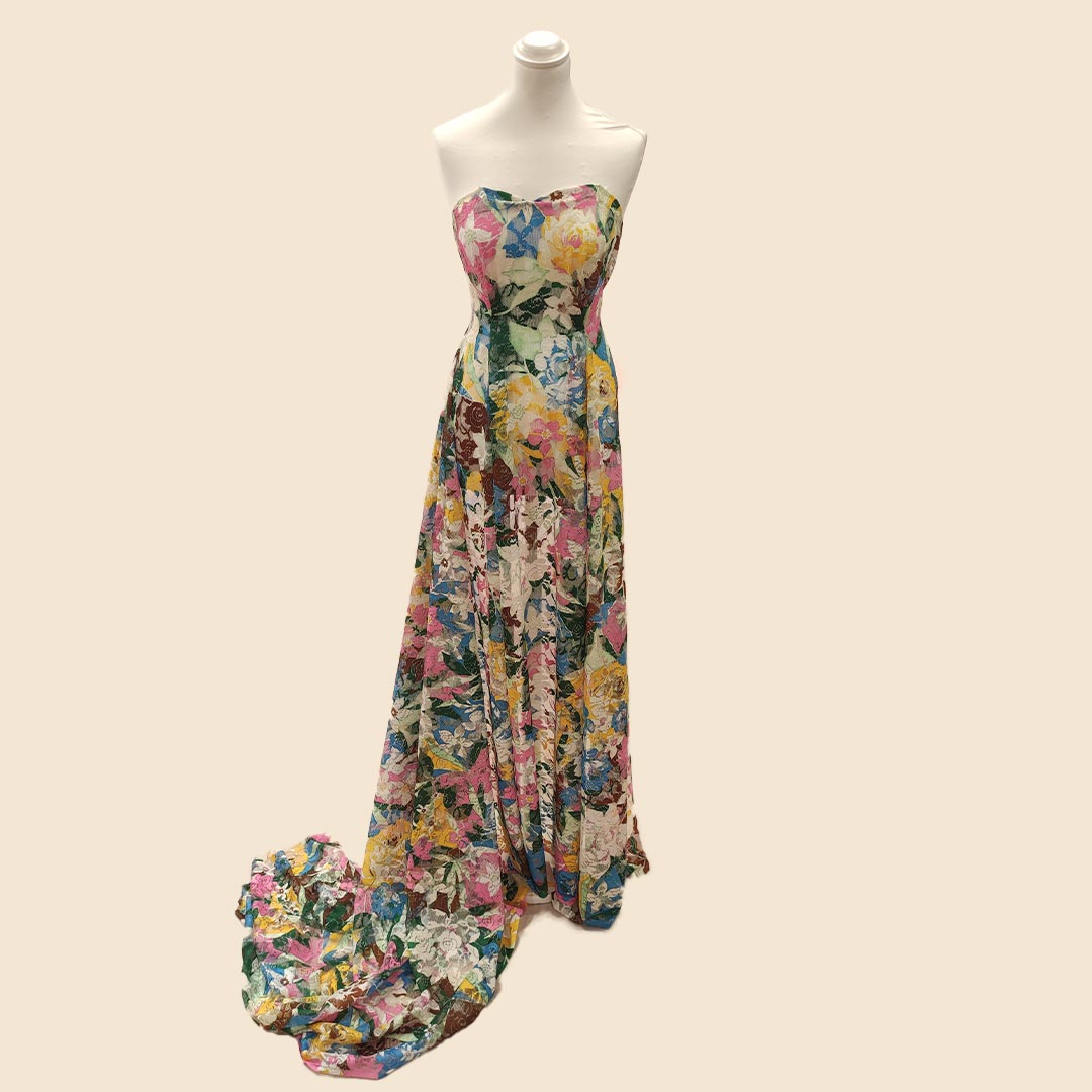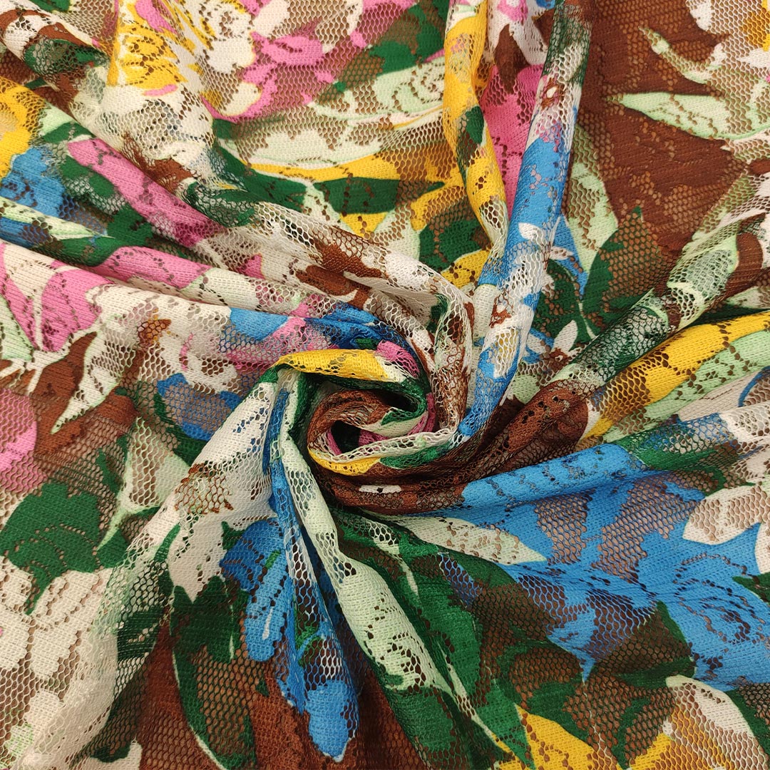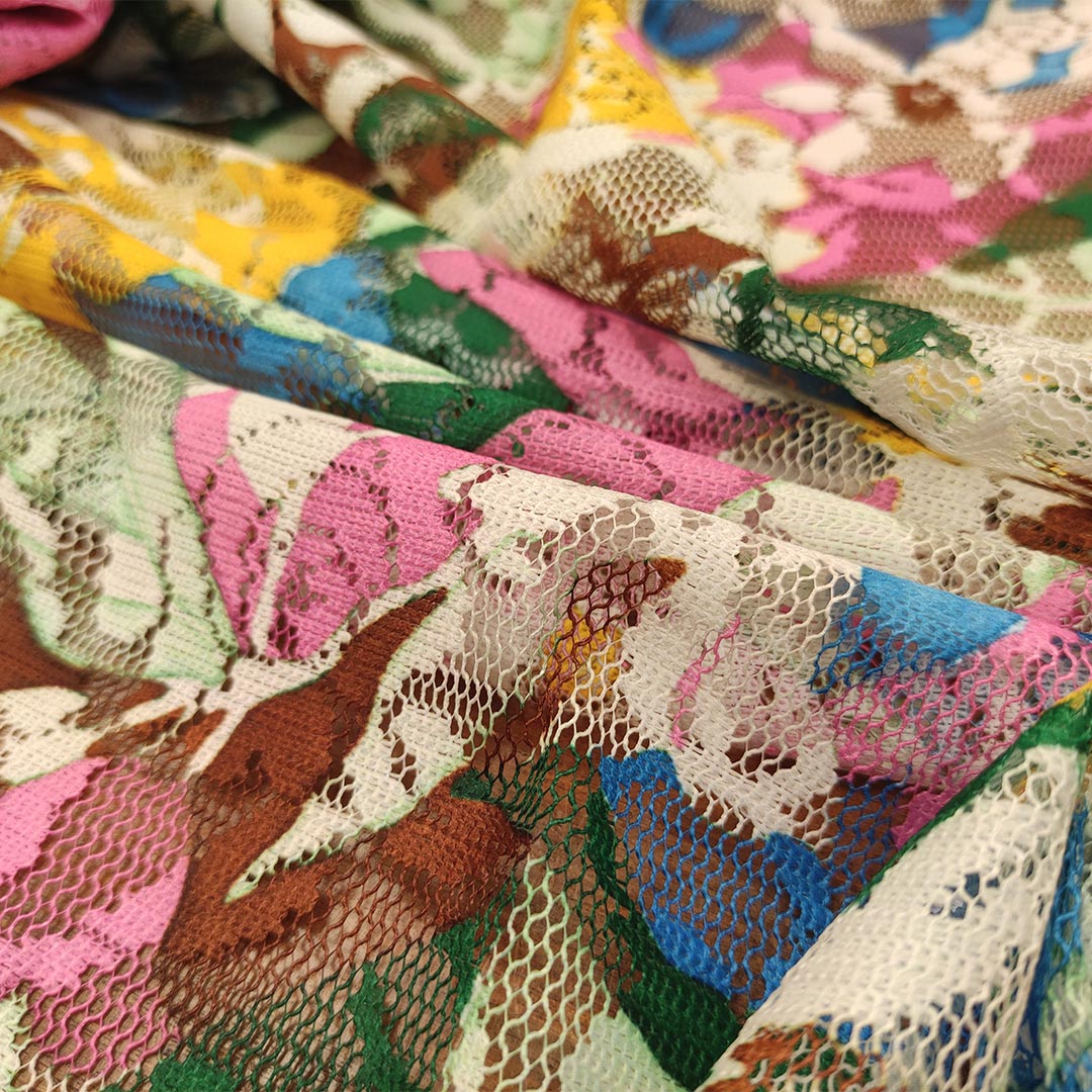 Tessuto pizzo elasticizzato a fantasia motivo floreale verde – bianco – turchese – giallo