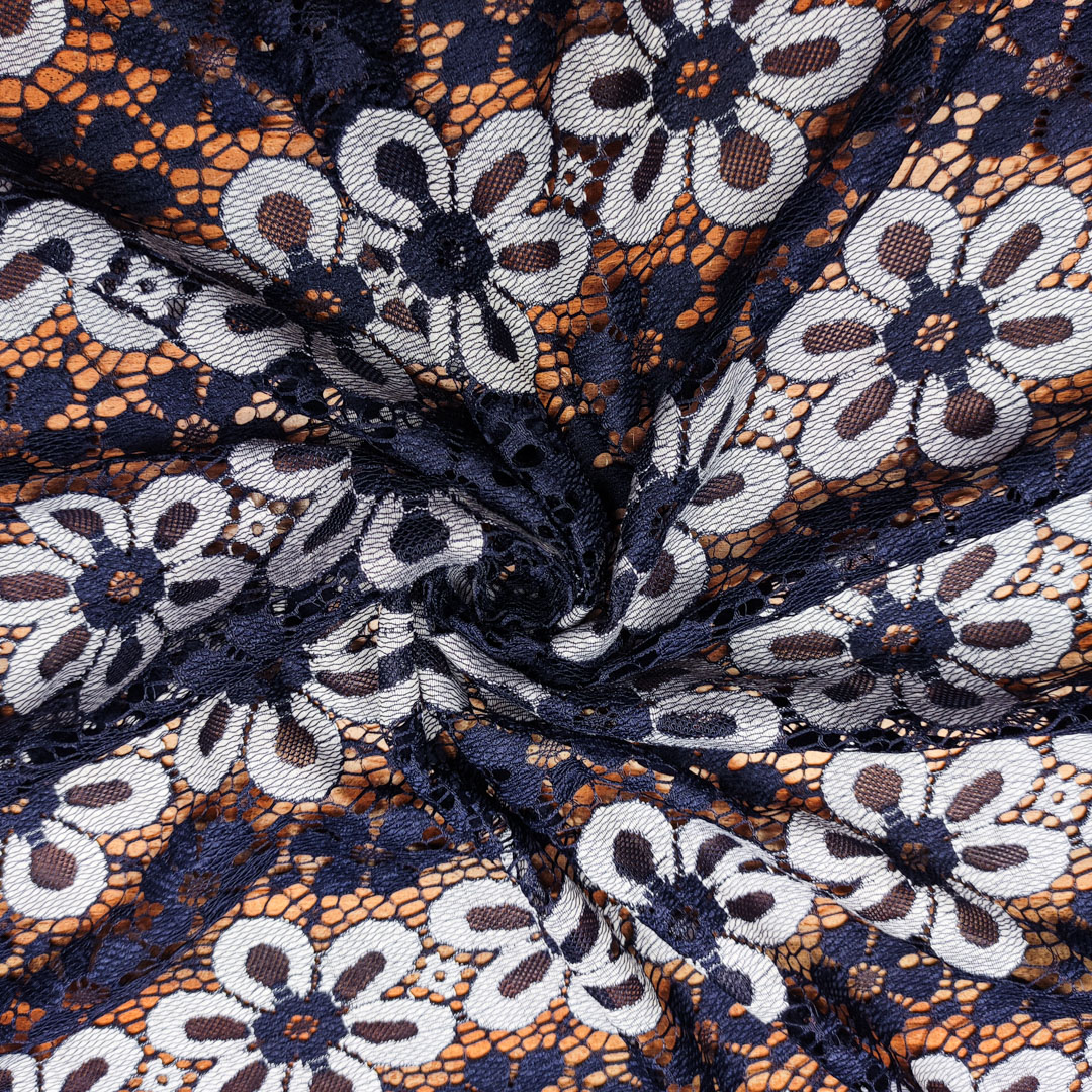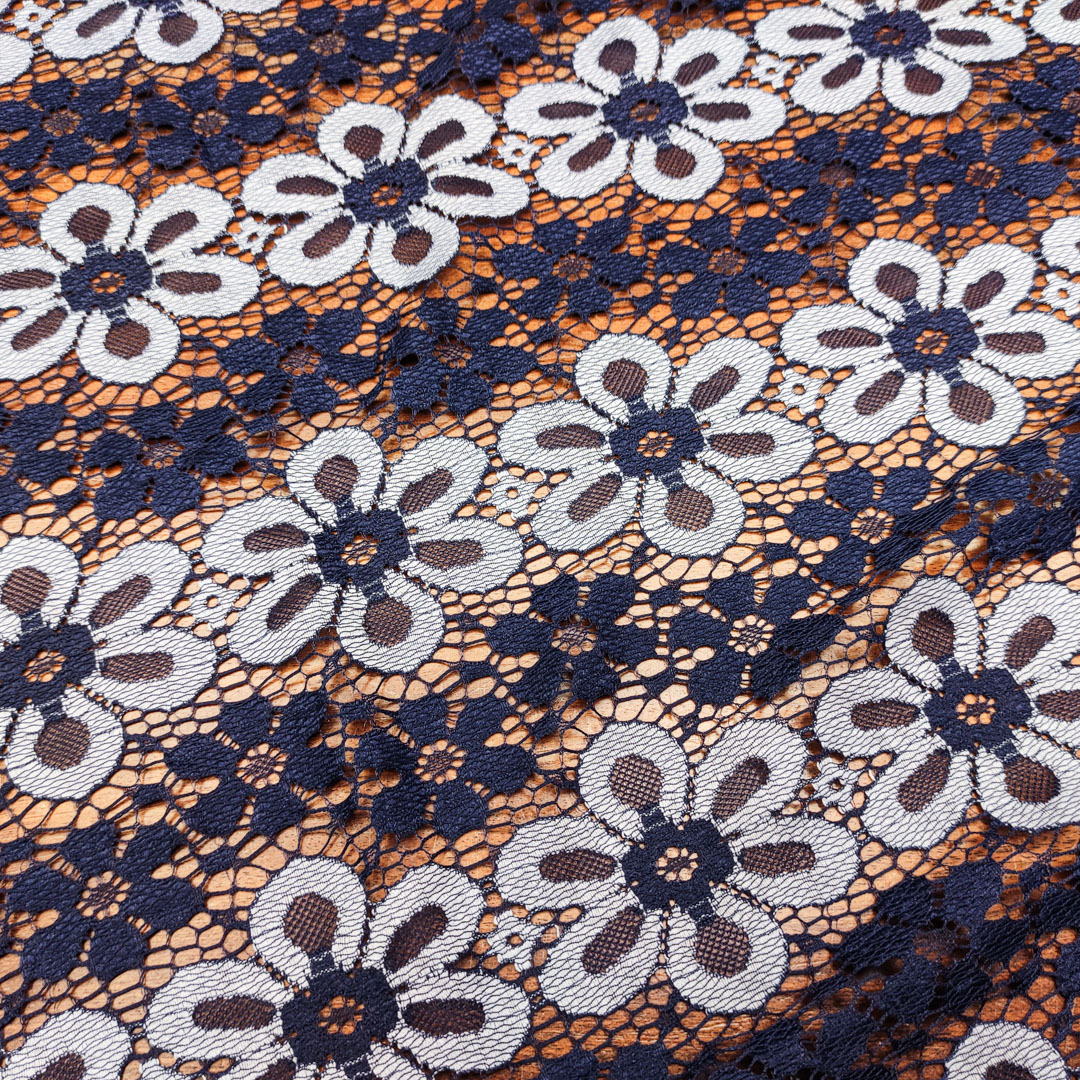 Tessuto pizzo elasticizzato motivo floreale blu – grigio