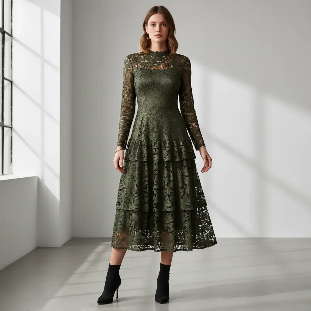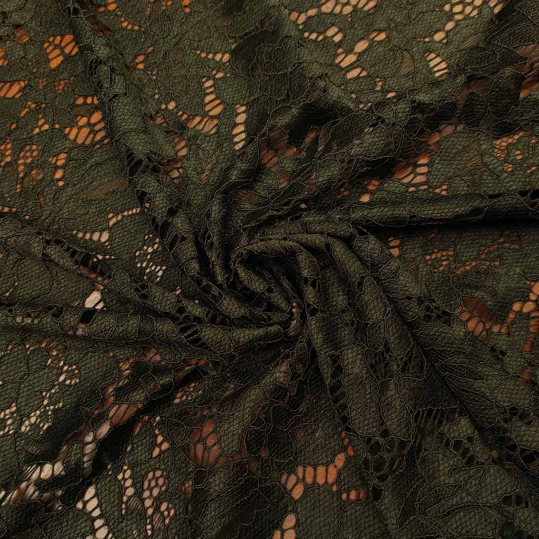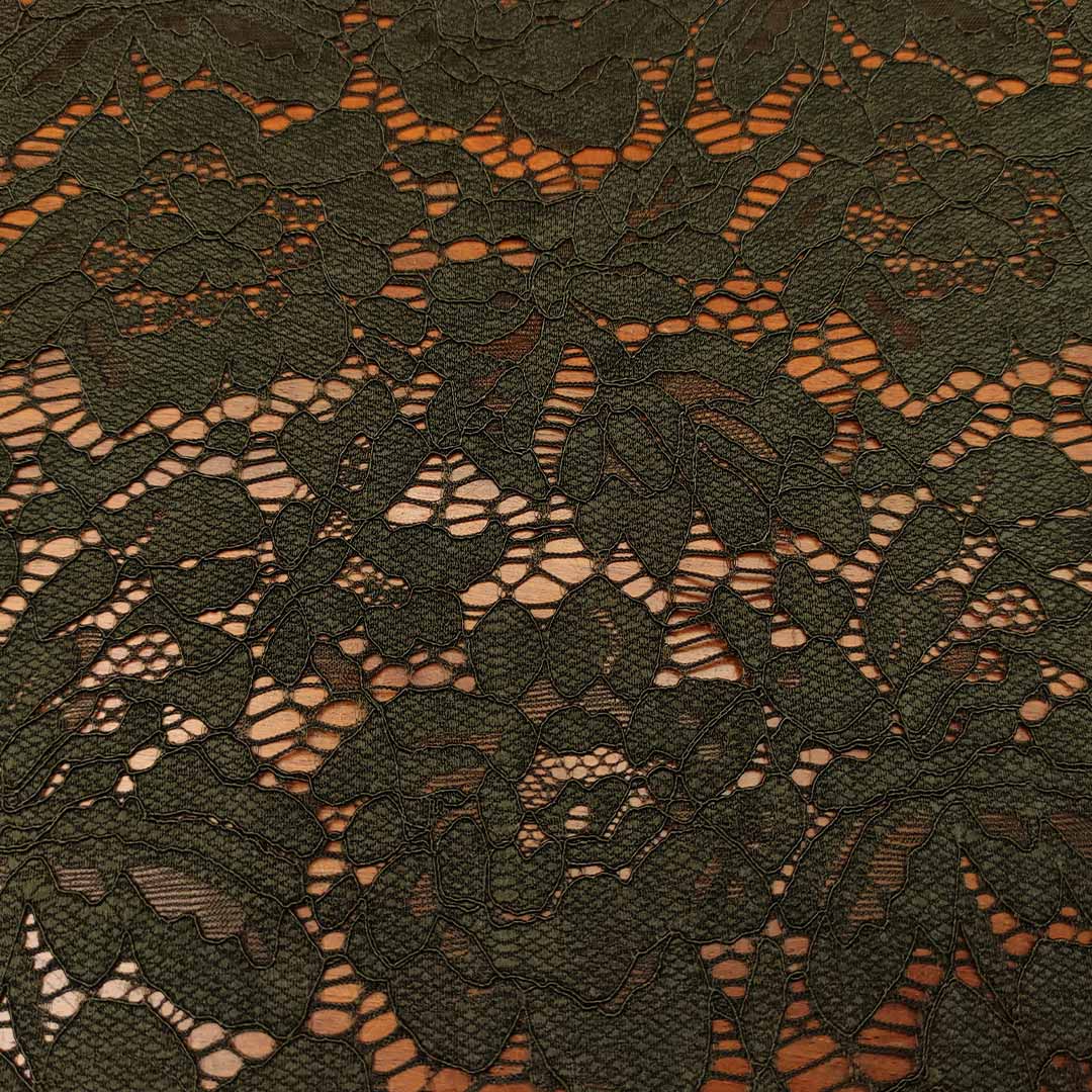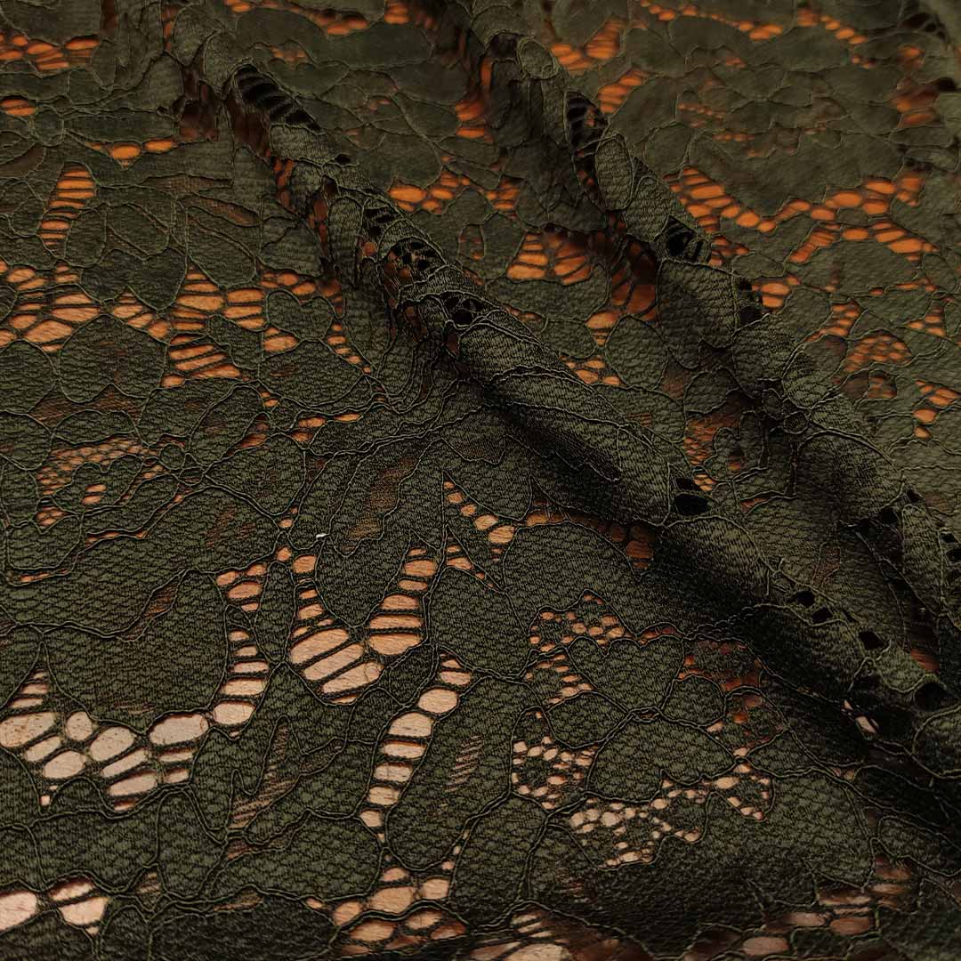 Tessuto pizzo elasticizzato motivo floreale verde militare