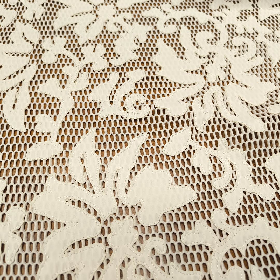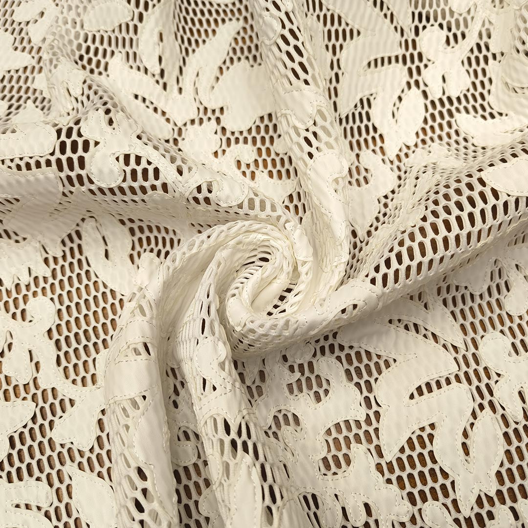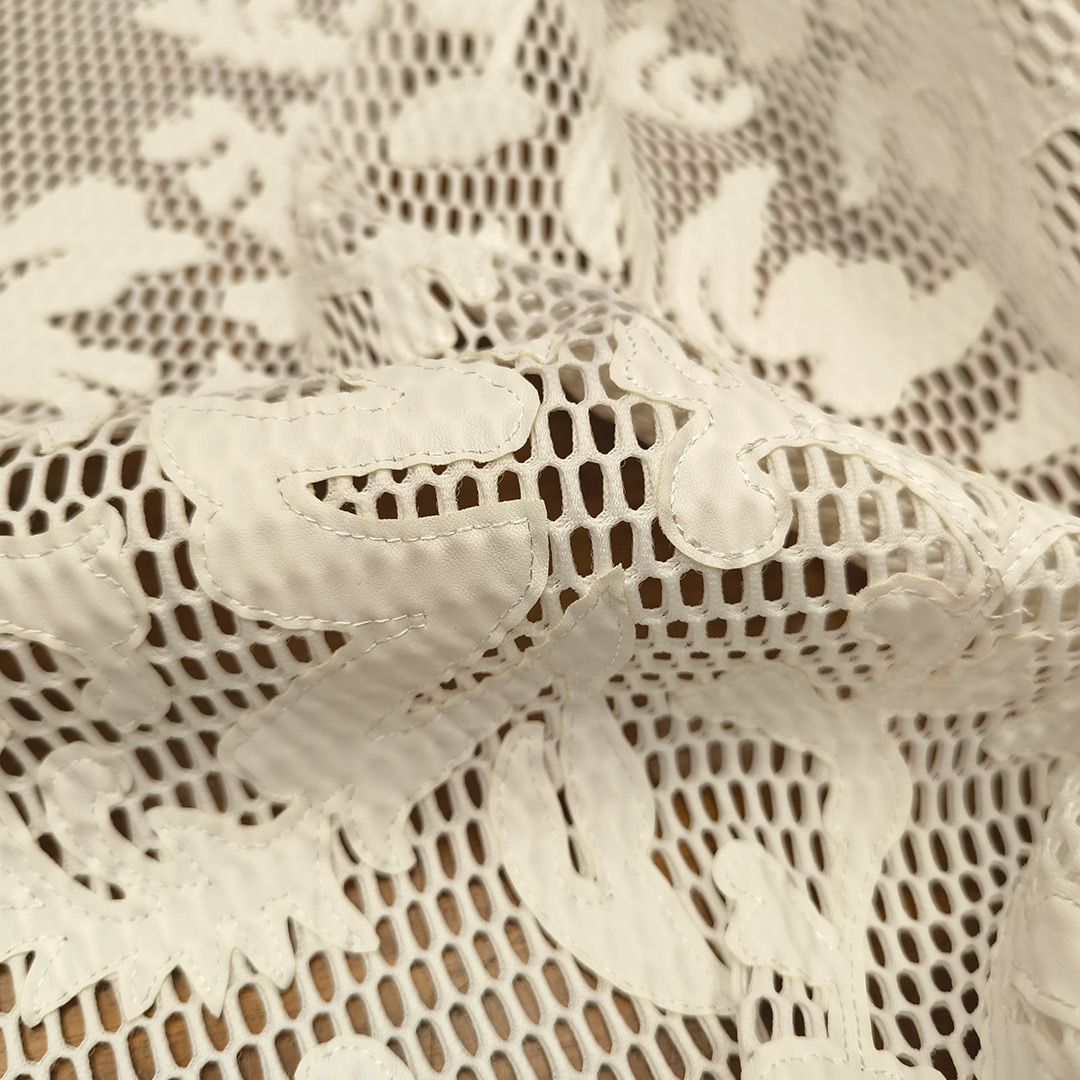 Tessuto Rete con applicazioni motivo floreale in ecopelle tinta unita bianco