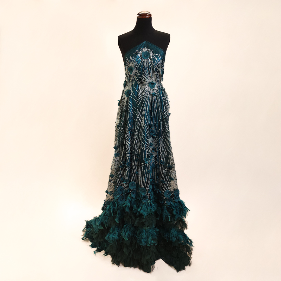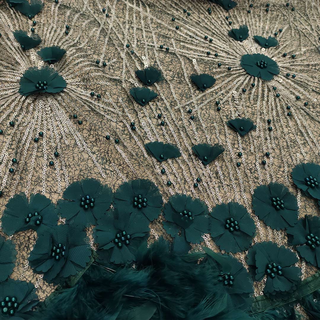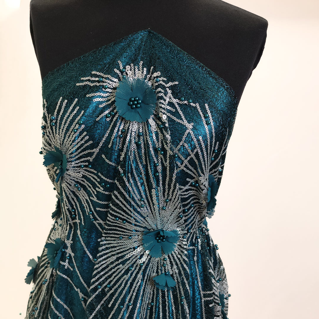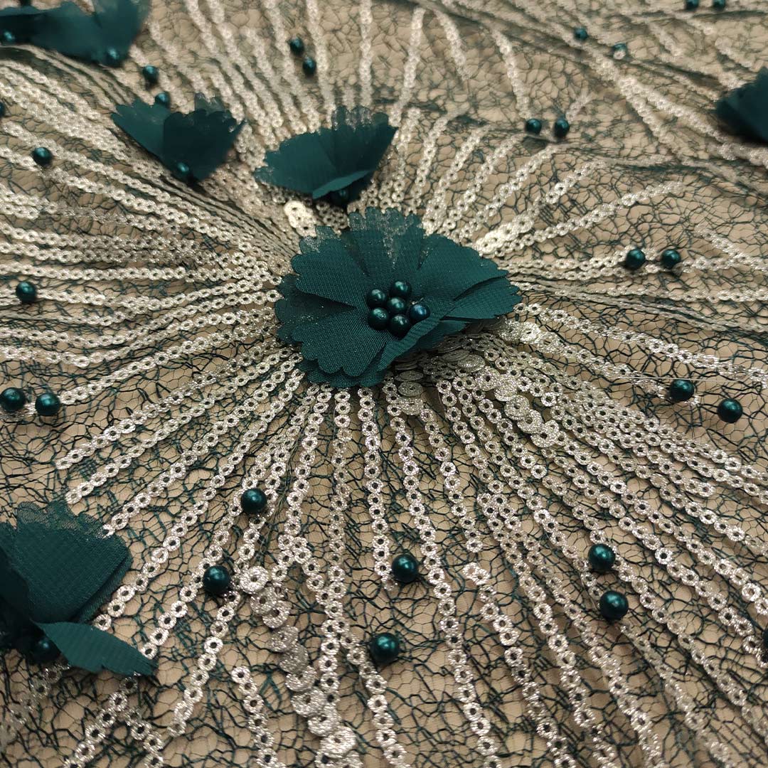 Tessuto Tulle-Pizzo ricamato con paillettes e perle e con fiori 3d motivo geometrico verde petrolio