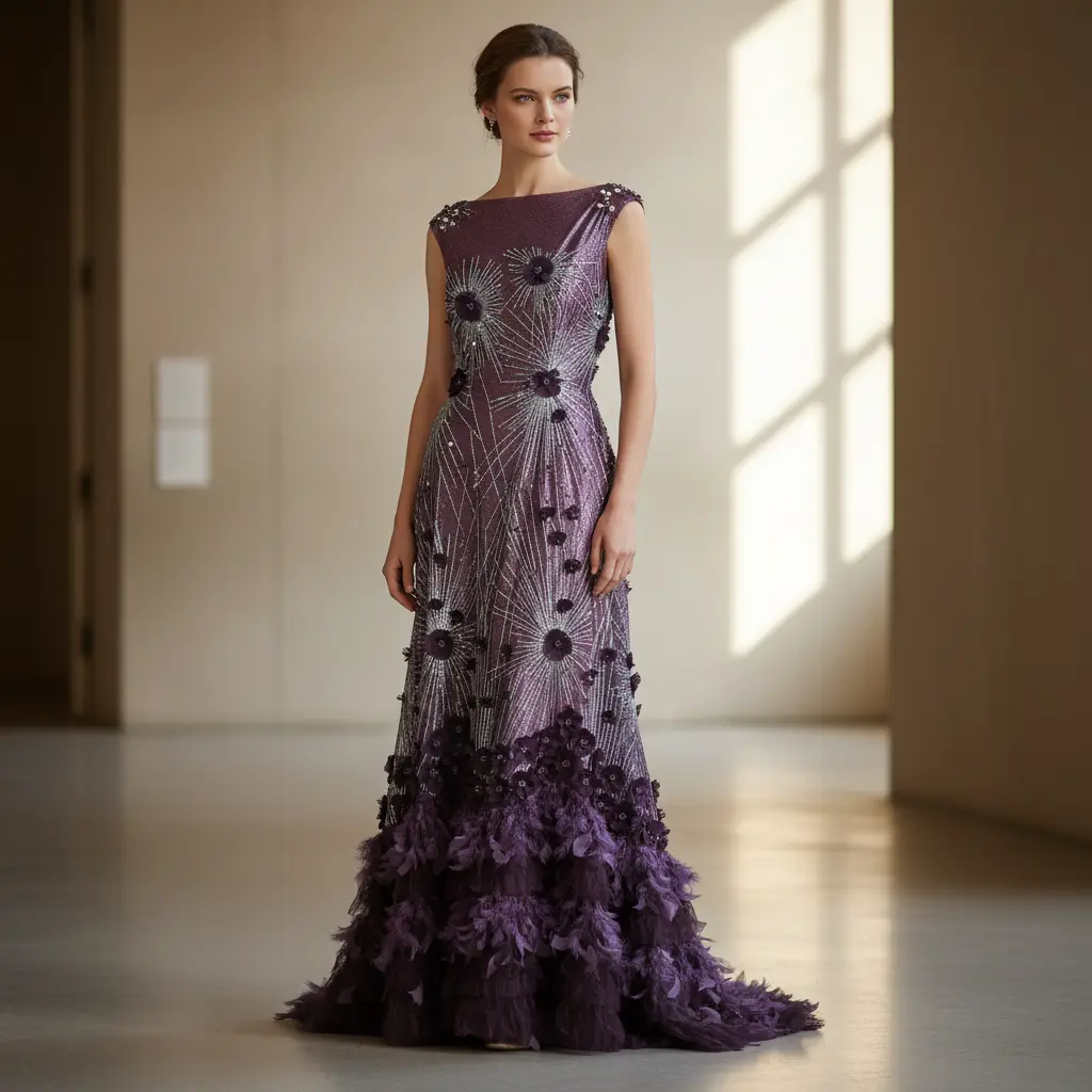 Tessuto Tulle-Pizzo ricamato con paillettes e perle e con fiori 3d motivo geometrico vinaccio