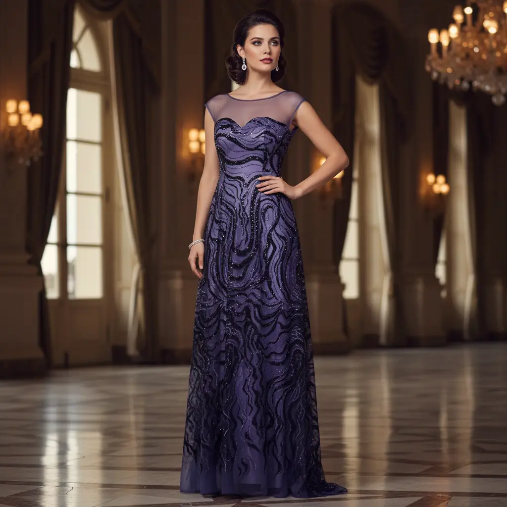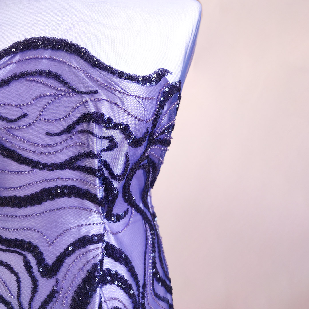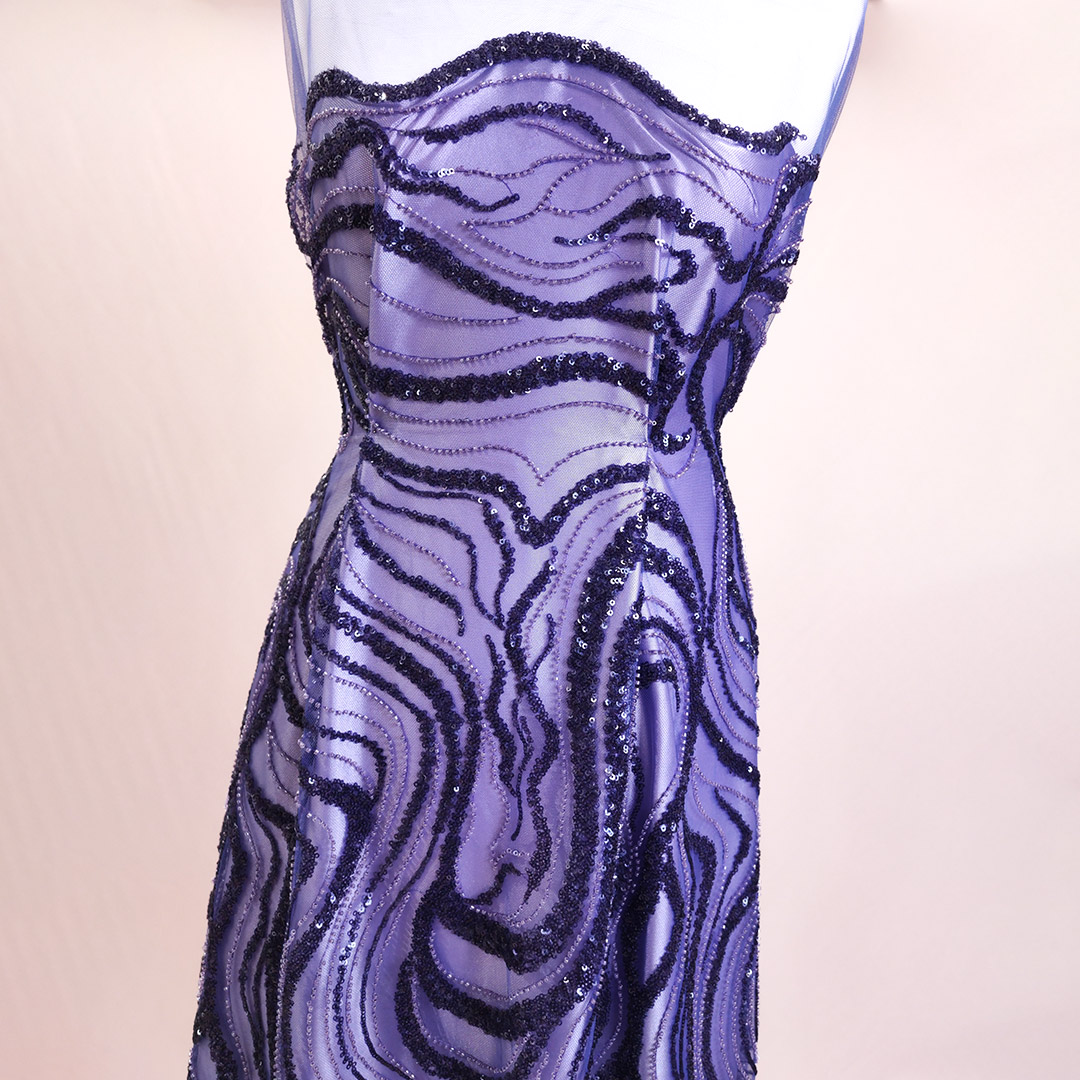 Tessuto tulle-pizzo ricamato con paillettes motivo astratto viola